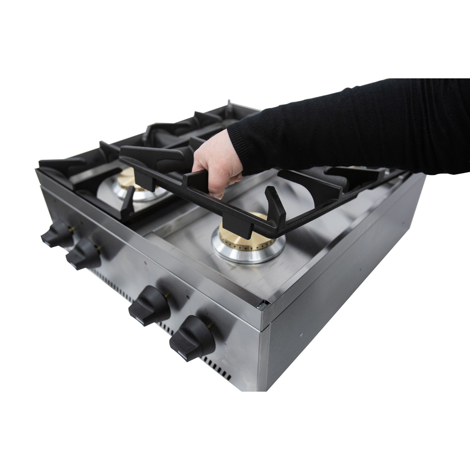 This versatile boiling top from Parry is ideal for use in a commercial kitchen. With four powerful dual concentric hob burners it delivers a consistent, even heat to pans of various sizes for a range of cooking needs, from a gentle simmer to a rolling boil. The simple dial controls adjust the gas burners individually for excellent control over the heat level of each to suit your needs. Enamelled pan supports protect the burners, allowing improved circulation of heat and a durable surface for daily use with heavy pots and pans. With a low flue, this unit has a low profile making it comfortable to work with and compatibility with pans of even large sizes, perfect for handling the various tasks required in a busy kitchen environment.