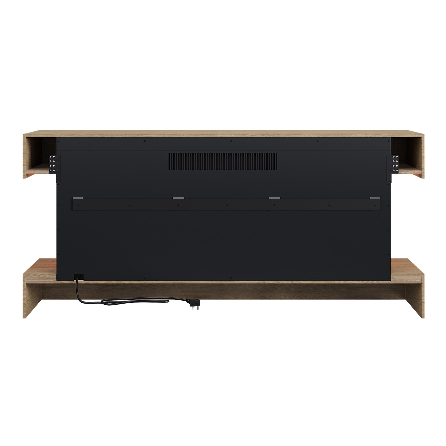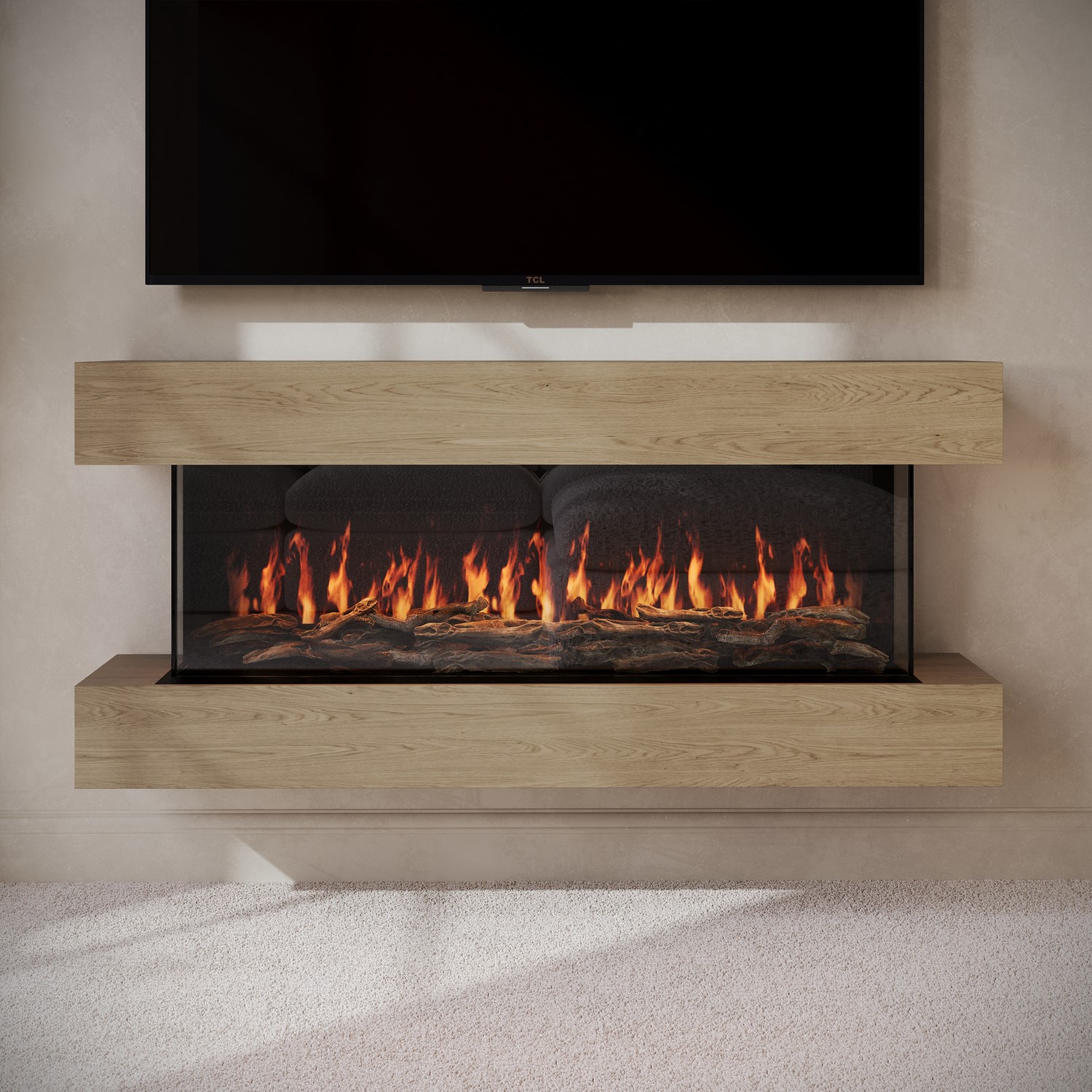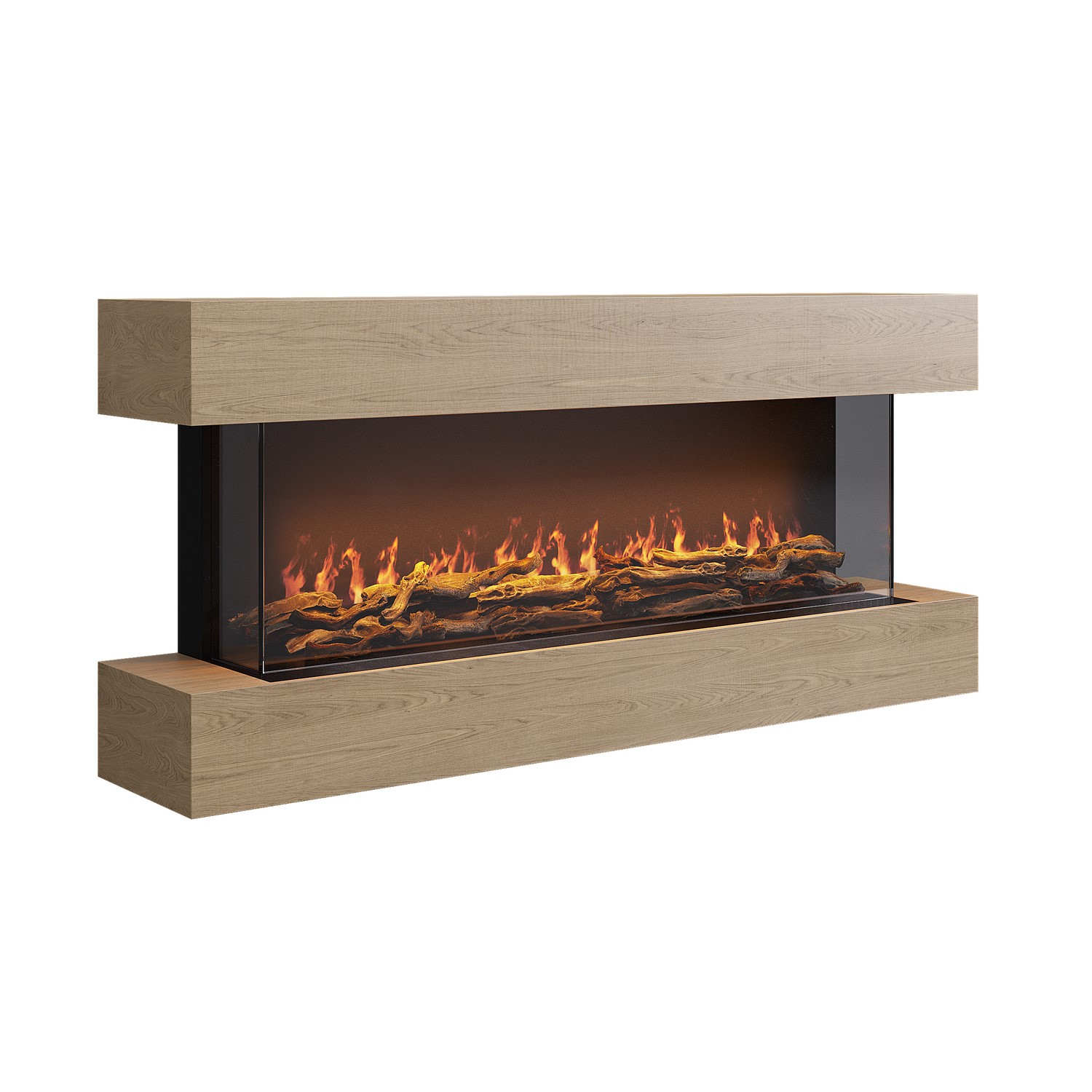 Bring warmth and modern elegance into your living space with this contemporary media wall fire featuring a 3-sided glass-front electric fire insert. Flanked by two natural oak effect beams – one at the base and one at the top – this fireplace creates a perfect focal point for any room. The realistic flame effect dances over sculpted logs, offering the ambiance of a traditional fire without the maintenance. Ideal for media wall installations, this piece combines stylish form with practical function.
