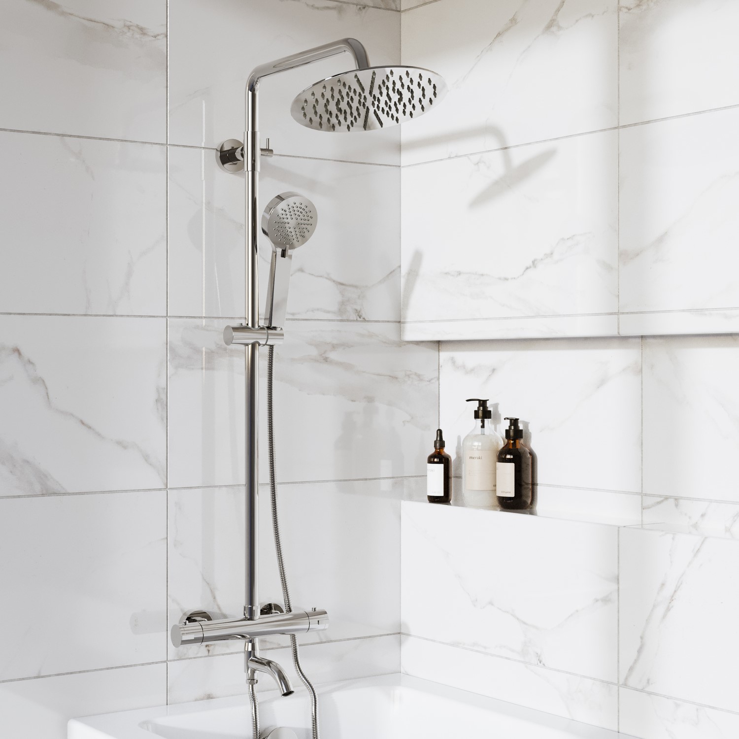 Thermostatic Exposed Shower with 3 Outlets: This all-in-one shower set includes a thermostatic bar valve that allows precise temperature control and easy switching between three water outlets—overhead shower, hand shower, and bath spout.