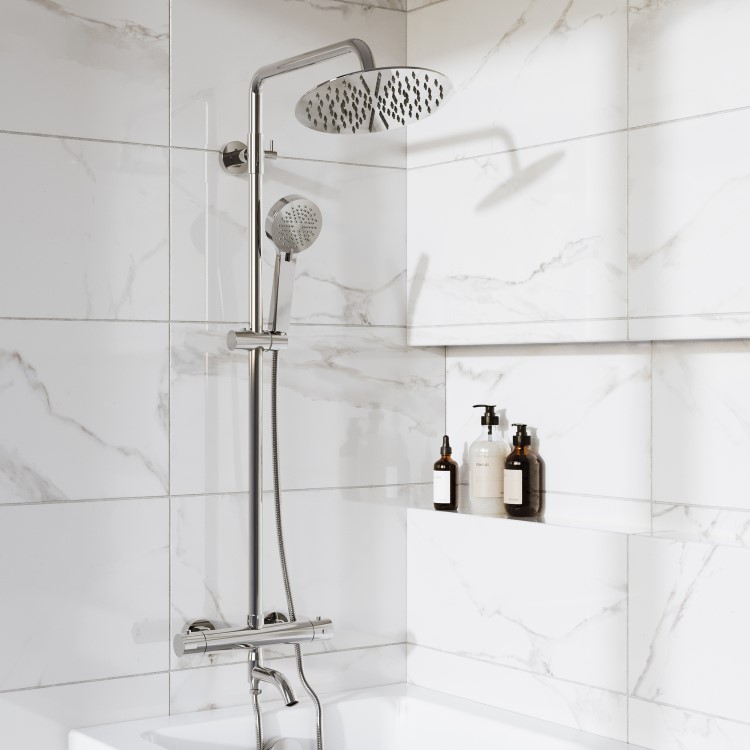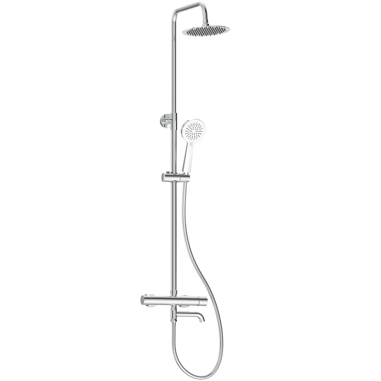 Bring contemporary style and everyday functionality to your bathroom with this all-in-one thermostatic exposed shower set with 3 outlets. The large 200mm overhead rainfall shower delivers full-body coverage for a spa-like experience, while the adjustable 100mm hand shower—complete with three spray settings and a smooth 150cm PVC hose—adds flexibility and control, ideal for families and focused rinsing. The integrated 120mm foldable bath spout conveniently swings out when needed and tucks away when not in use, keeping your space looking clean and minimal. A thermostatic bar valve provides precise temperature control and allows you to easily switch between the three water outlets—overhead shower, hand shower, and bath spout—for a safe and seamless experience.