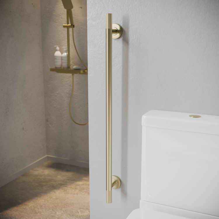 Add modern practicality to your space with this brushed brass grab bar. This large grab rail is suitable for wet and dry installation so it is perfect for the bathroom environment. This large grab rail can be hung vertical or horizontal depending on your needs. Perfect for use as a toilet grab rail, bath grab rail or shower support, it delivers accessible functionality without sacrificing visual appeal. Crafted from corrosion-resistant stainless steel, it’s robust enough to support up to 150kg while its knurled detailing and concealed fixings adds elegance. Whether you're future-proofing your bathroom or supporting everyday mobility needs, this rail brings subtle reassurance right where it's needed.