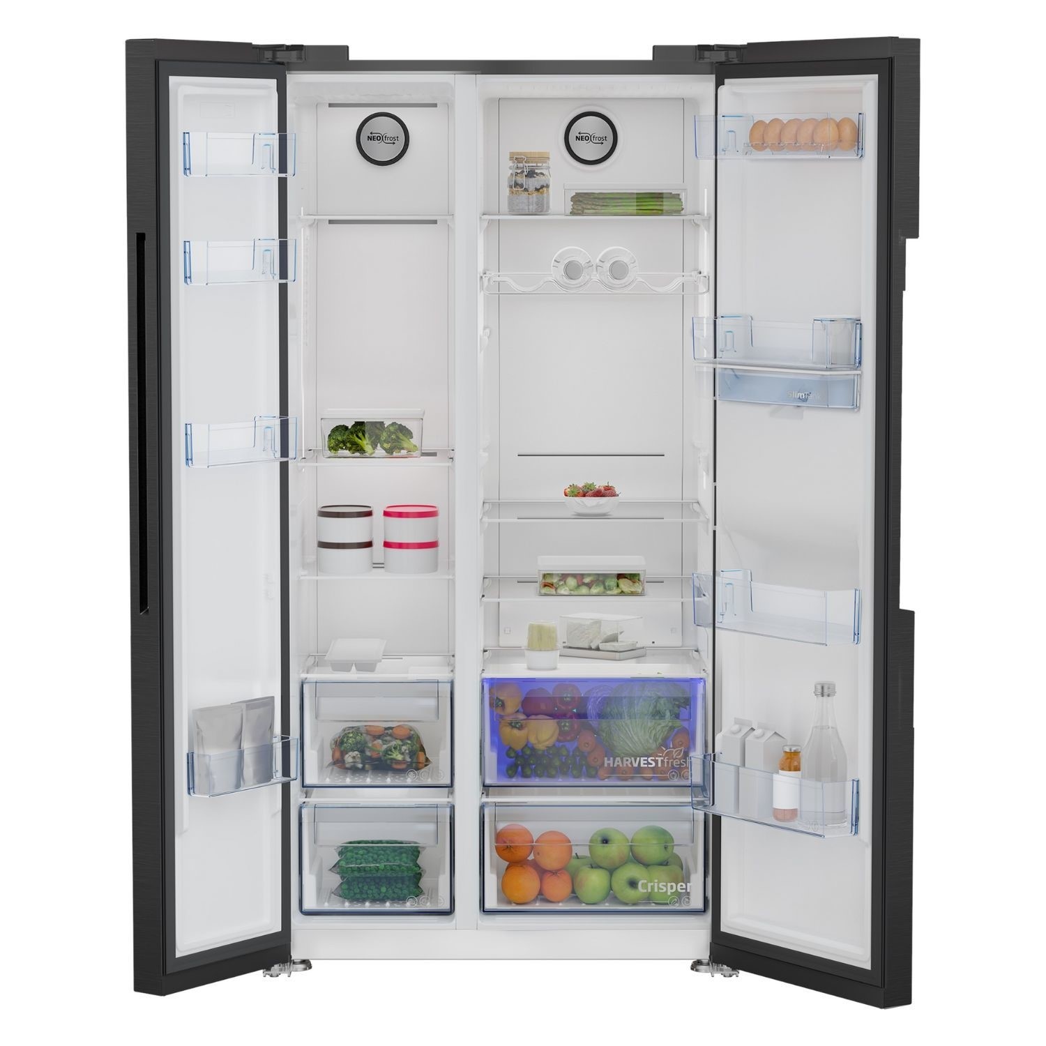Featuring our advanced HarvestFresh™ technology, this Freestanding American Style Fridge Freezer uses three-colour light technology to preserve the vitamins in your fruit and veg for up to five days in the crisper drawer. So you can relax knowing that your family are eating the most nutritious meals possible. Offers your ready to drink cold water at any time with the Non-Plumbed Water Dispenser with Child Lock. And, to help you feel confident in your purchasing decision, this model is available for our 10 Year Beko Parts Guarantee.