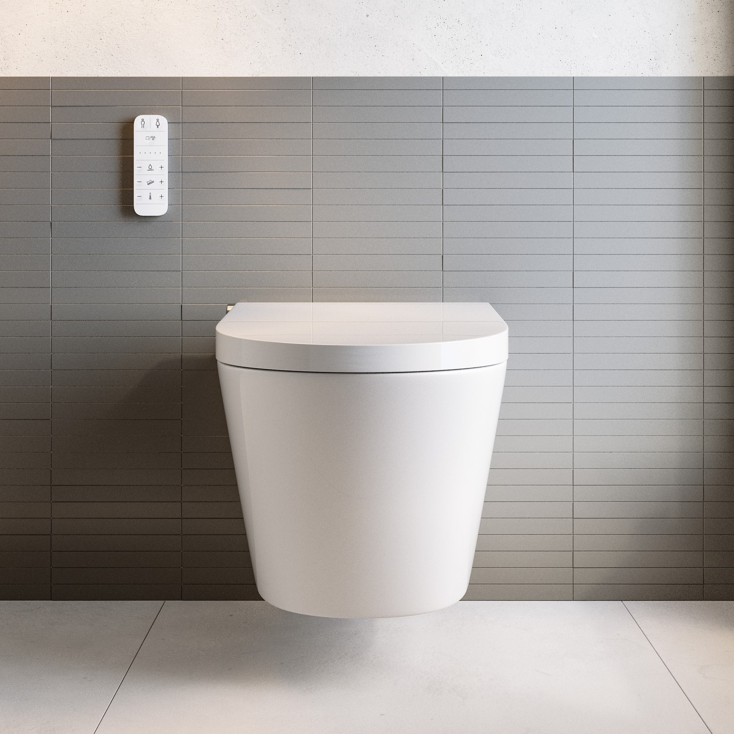 Control your smart toilet using the remote that attaches to a wall or via the on-seat control.
