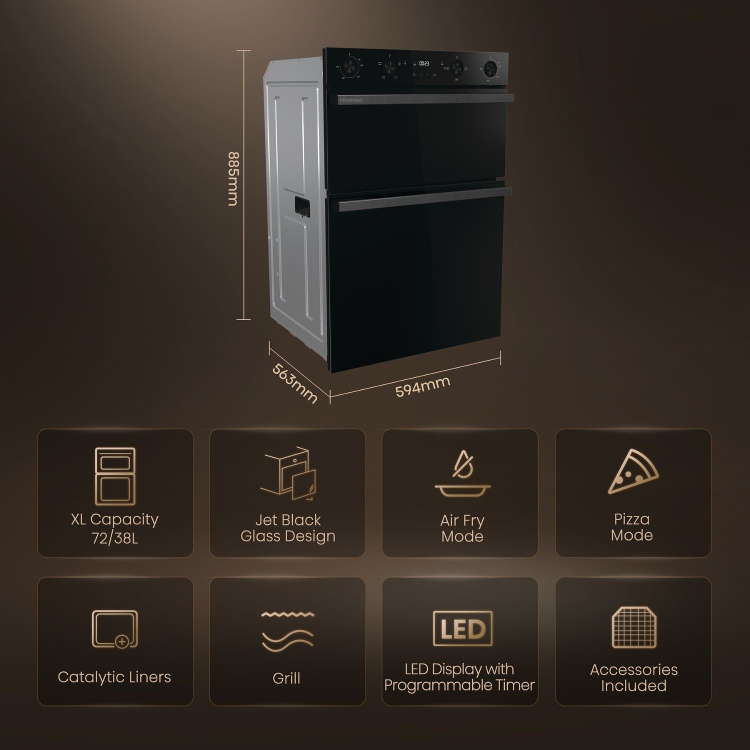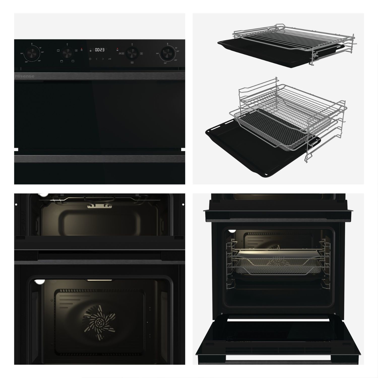 Introducing our Hi6 premium built-in double oven range, where innovation meets elegance. With its expansive XL capacity, perfectly designed to cater to your largest gatherings with ease. Admire the sleek jet black glass design that adds a touch of sophistication to any kitchen. Embrace versatility, with the included air fry and pizza modes, perfect for achieving crispy perfection and restaurant style results, without the need to purchase an additional appliance. And with catalytic liners facilitating effortless cleaning, maintaining the pristine appearance of your oven is no longer a chore but a breeze. The Hisense Hi6 range comes complete with a suite of added accessories, whether you’re experimenting with gourmet recipes or simply preparing every meals, these accessories provide the versatility and convenience you need to excel in the kitchen. Welcome to a new standard of cooking excellence with the Hisense Hi6 built-in double oven range.