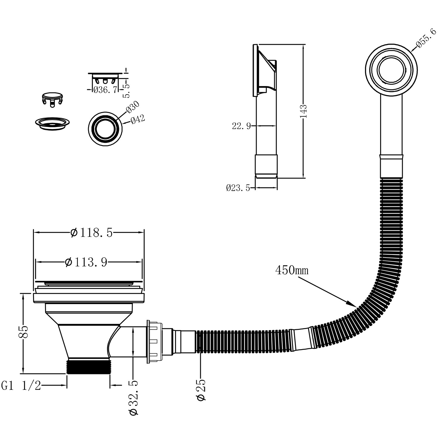 - Waste Dimensions: W118.5 x D113.9 x H85 mm