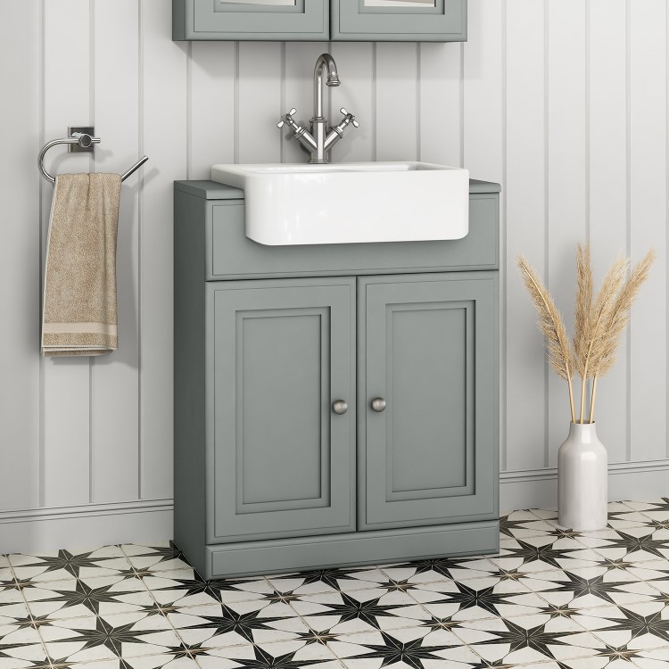 The Westbury traditional matt grey vanity unit with a glossy ceramic semi-recessed basin is the perfect transitional, traditional Vanity unit. Both the doors and front fascias feature a striking yet beautiful panelling design. The Westbury Range of delightful bathroom furniture hosts classic styling with practical storage solutions. The Vanity Unit features an internal shelf providing generous storage space for your toiletries, helping to keep your bathroom clutter-free. To maximise the amount of basin space for washing, the semi-recessed basin protrudes from the unit but is designed to look more purpose fitted.
