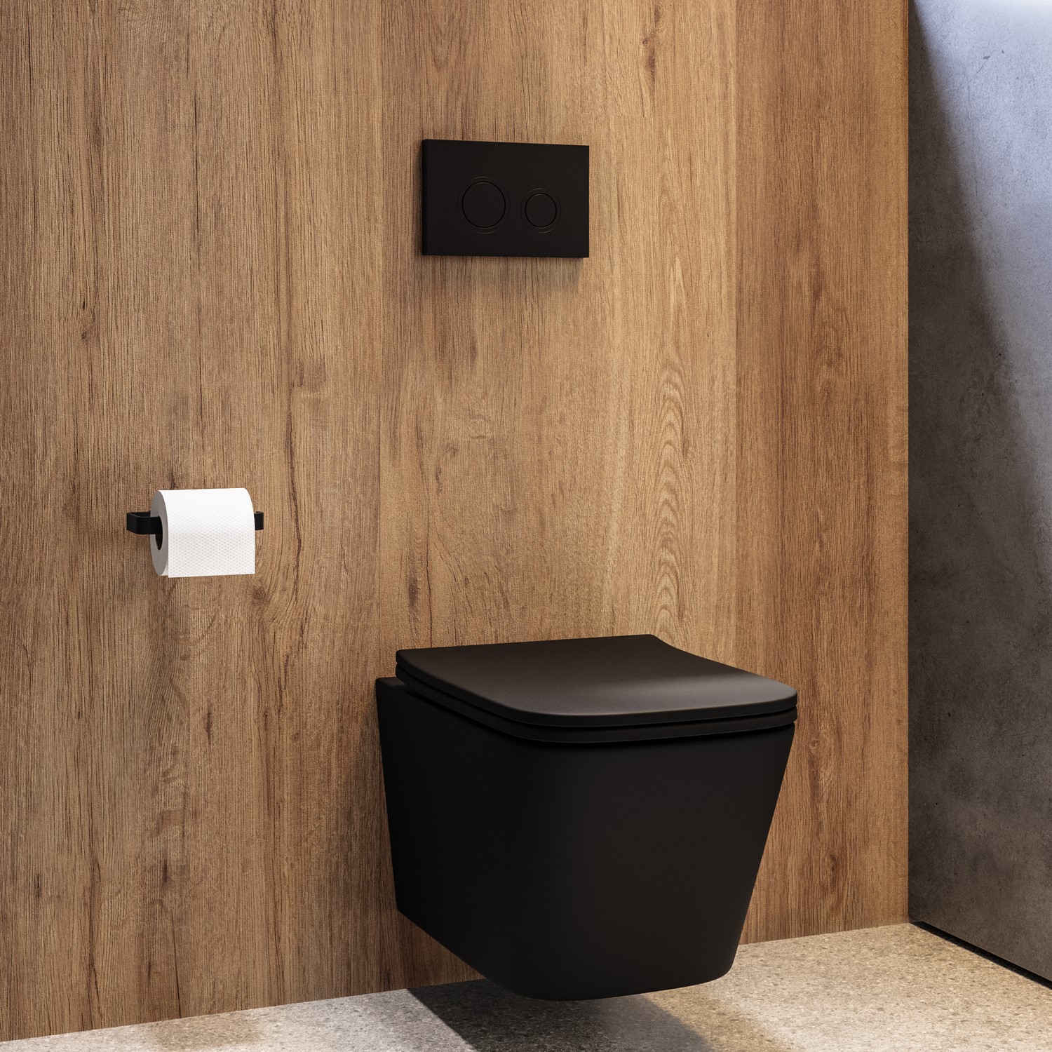 Wall-Hung Matt Black Design: A sleek square rimless pan with a bold matt black finish and matching hinges creates a floating effect that’s stylish, hygienic, and easy to clean.