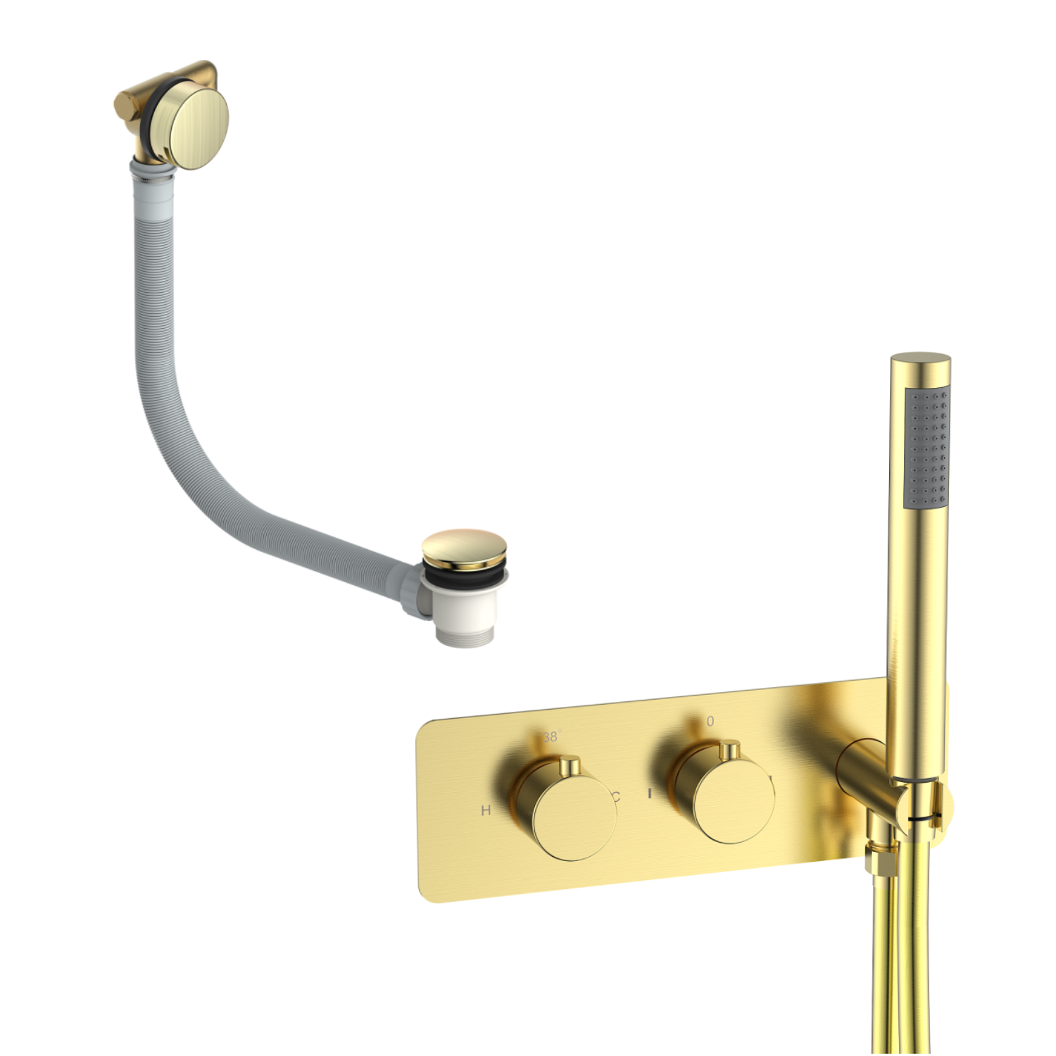 The Arissa Brushed Brass bath overflow filler with 2 outlet valve and hand shower set brings together elegant design and everyday functionality in one complete solution. The dual outlet shower bundle combines a shower hand set with an overflow filler, where the bath fills from the overflow like a waterfall style spa-like experience. The integrated bath filler removes the need for traditional taps, enhancing the clean, minimalist aesthetic.