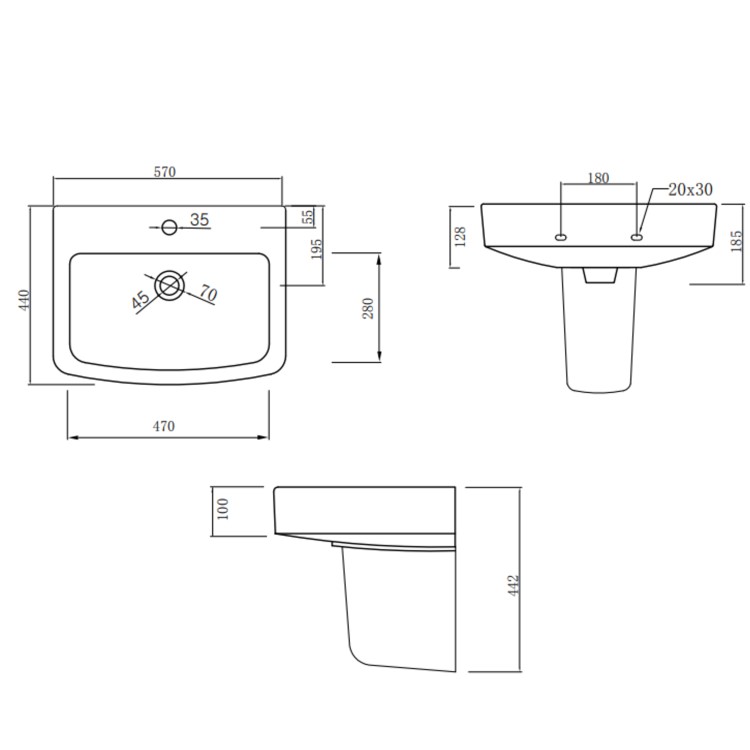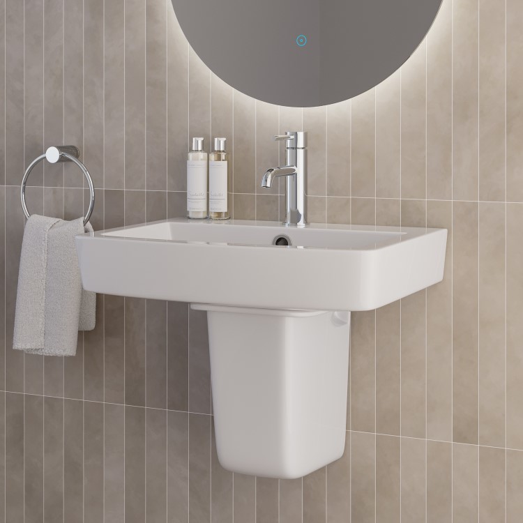The Ashford 570mm semi pedestal basin combines modern styling with a compact footprint, making it a smart solution for bathrooms where space is limited. Designed as a semi pedestal sink, it mounts neatly to the wall, concealing pipework while keeping the floor space free for a clean and open feel.