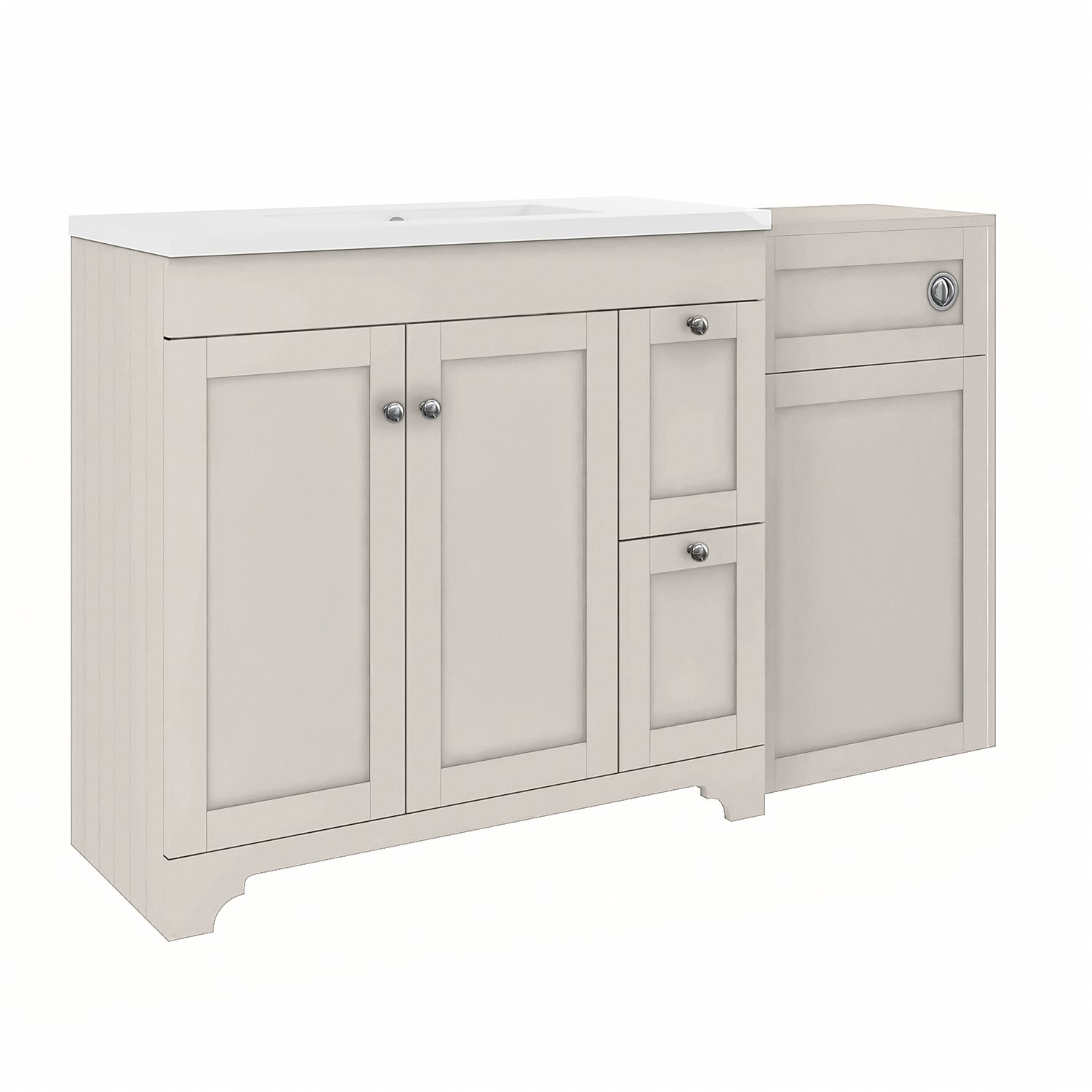 Enhance your bathroom with this charming Baxenden 1400mm toilet and sink unit, finished in a classic matt beige. The traditional styling features classic tongue-and-groove side panelling, shaker doors and ornate front skirting details to add a feature piece to your bathroom. This toilet and sink unit provides ample storage with a shelved cupboard behind the soft close doors, alongside two additional side drawers for smaller toiletries, and is reversible meaning you can chose which side the toilet unit and pan sit to suit your bathroom layout. The vanity unit and toilet unit can also be separated if you wish and positioned apart from one another.