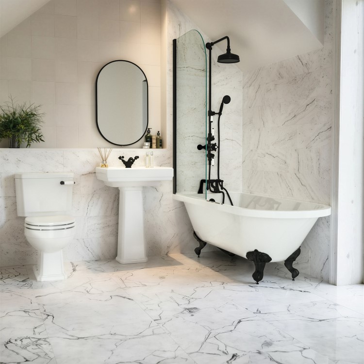 Make a statement in your bathroom with our traditional Park Royal shower bath suite. Roll-topped and single-ended, the bath features smooth, curved edges for a luxurious and relaxing bathing experience. The gloss finish enhances its timeless appeal, while the beautifully ornate matt black ball and claw feet add a striking contrast. The traditional curved design fits neatly into your bathroom, and the bath screen is reversible, meaning the shower bath can be installed into a left or right corner, and its adjustable feet ensure a level fit. Made from 4-6mm acrylic, reinforced with fibreglass for durability the bath is resistant to staining, chipping, and cracking, ensuring longevity. The hinged bath screen rotates 90° both inward and outward for easy access, and is made from toughened 6mm safety glass with an easy-clean finish, meaning water runs off the glass easily for less wiping. With no pre-drilled tap holes, you have the option to use deck or wall mounted taps (sold separately).
