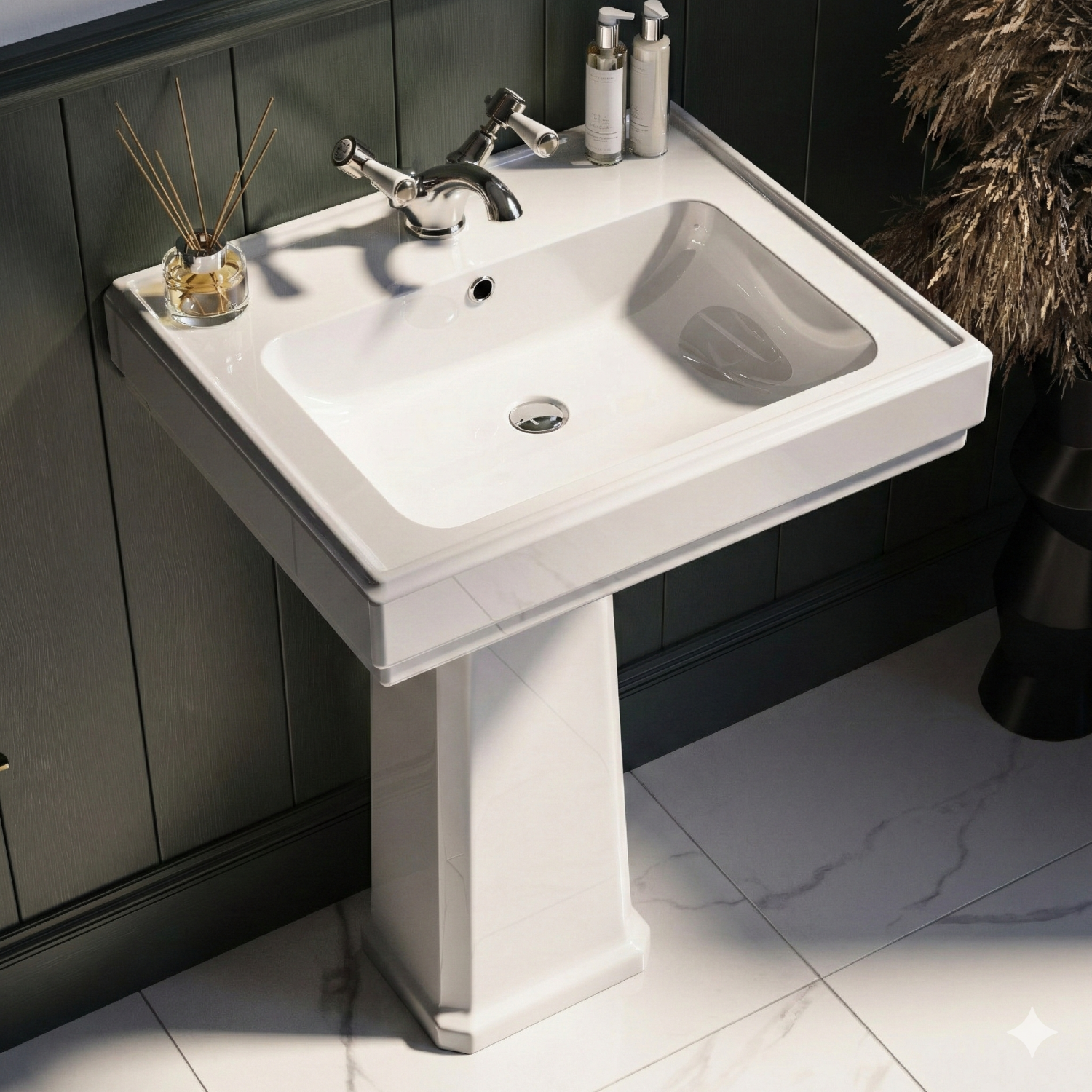 Rectangular Pedestal Basin: Includes a chrome overflow and slotted basin waste for a classic finish, and its smooth full pedestal neatly conceals pipework.