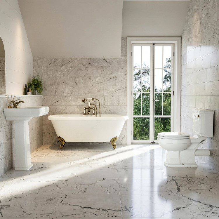 Make a statement in your bathroom with our traditional Park Royal freestanding bath suite. Roll-topped and double ended, the 1515mm freestanding bath features smooth, curved edges at both ends, and the waste and overflow are located in the centre of the bath, allowing you to bathe in comfort from either side for a truly luxurious and relaxing experience. The gloss white finish enhances its timeless appeal, while the beautifully ornate brushed brass ball and claw feet add a striking contrast, making the bath a true focal point in any traditional bathroom. The freestanding design offers flexible placement within your space, and the adjustable feet ensure a stable, level installation. Made from 4–6mm acrylic, reinforced with fibreglass, the bath is resistant to staining, chipping, and cracking, ensuring long-lasting durability. With no pre-drilled tap holes, you have the freedom to choose deck mounted, wall mounted or freestanding taps to suit your preferred look (sold separately).