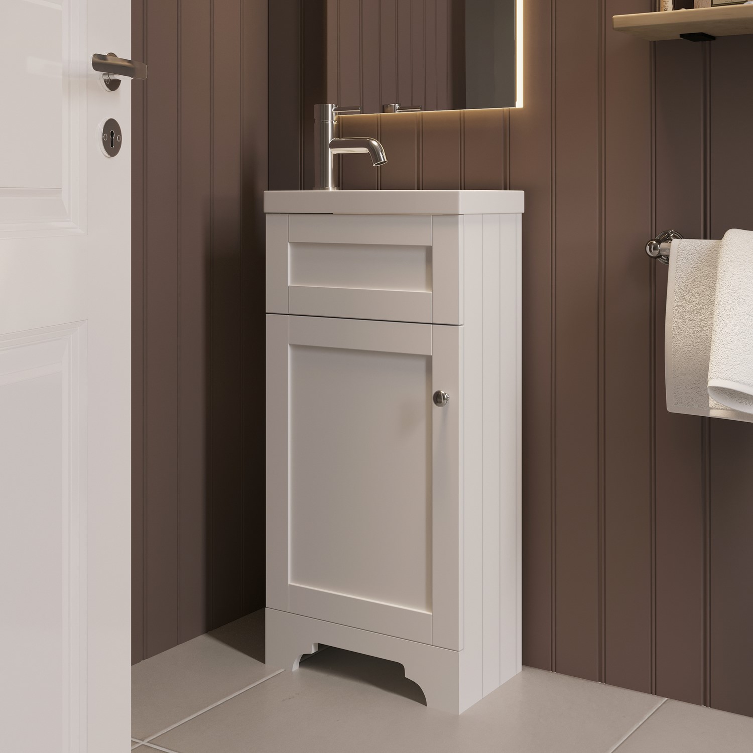 Traditional Basin Vanity Unit: Timeless shaker doors and detailing across the side panelling and front skirting brings classic charm to any bathroom.