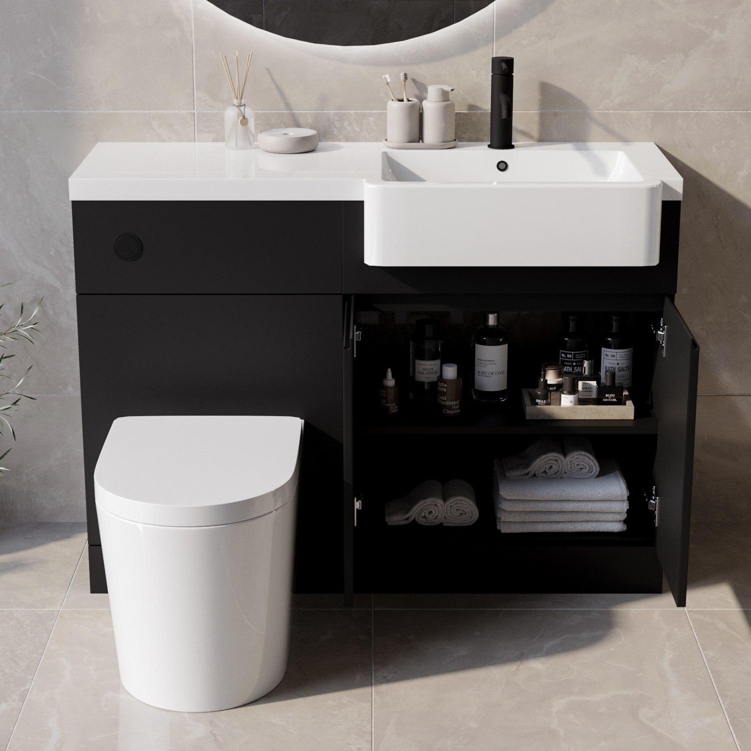 The unit has a white polymarble resin worktop and an integrated semi-recessed ceramic basin with black overflow and slotted basin waste. The unit features two soft close, push-to-open doors that reveal one shelf, resulting in two storage compartments ideal for storing all of your bathroom needs. Basin mixer tap and shower aren’t included, giving you the freedom to choose your own (please see recommended accessories).