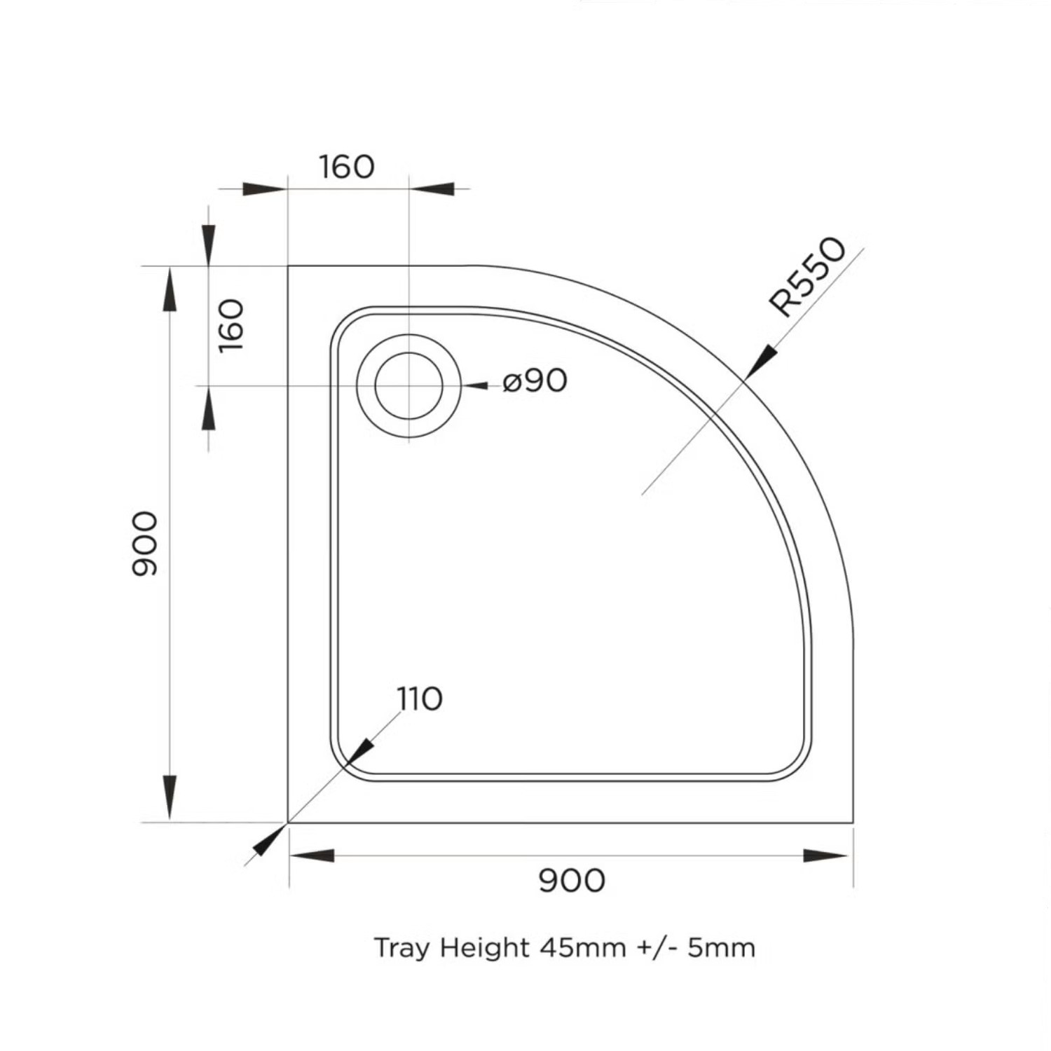 - White 45mm profiled shower tray with 90mm black waste is included
