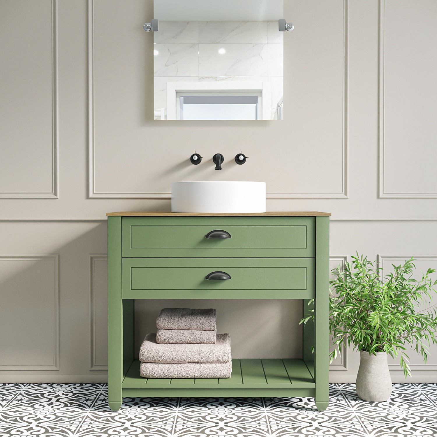 - Sage green vanity unit finished with a oak effect 18mm worktop