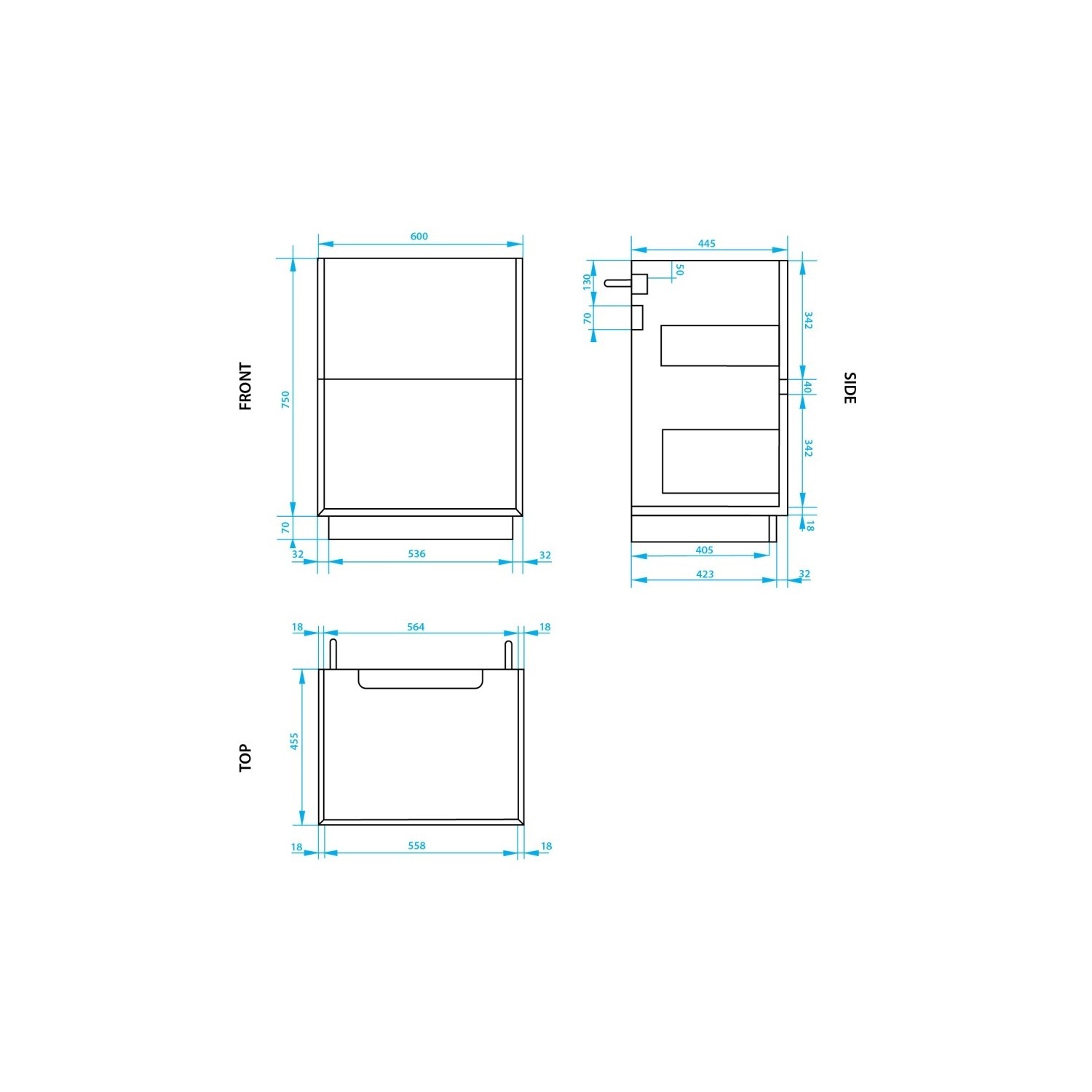 - Unit dimensions: H750 x W600 x D455 mm (give or take -/+ 3mm per measurement)
