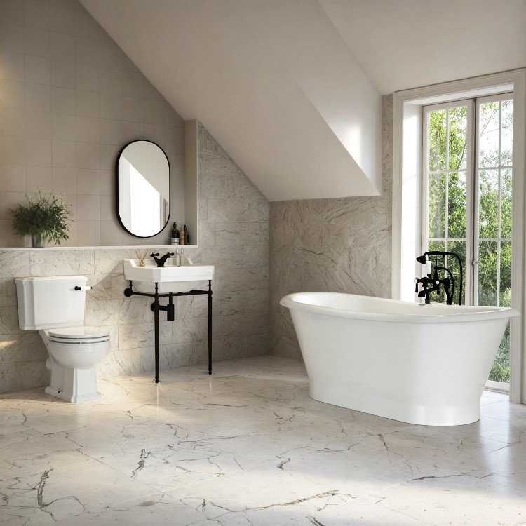 Victorian Style Suite: A complete bathroom set featuring 1690mm freestanding double-ended bath, close coupled toilet, and black washstand basin.