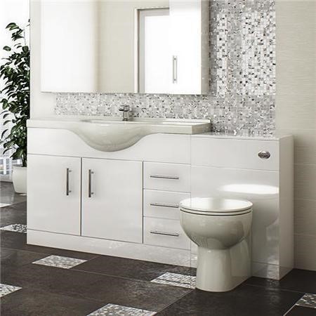 A large white vanity unit with 2 cupboard doors and 3 drawers. This unit comes complete with the ceramic basin.