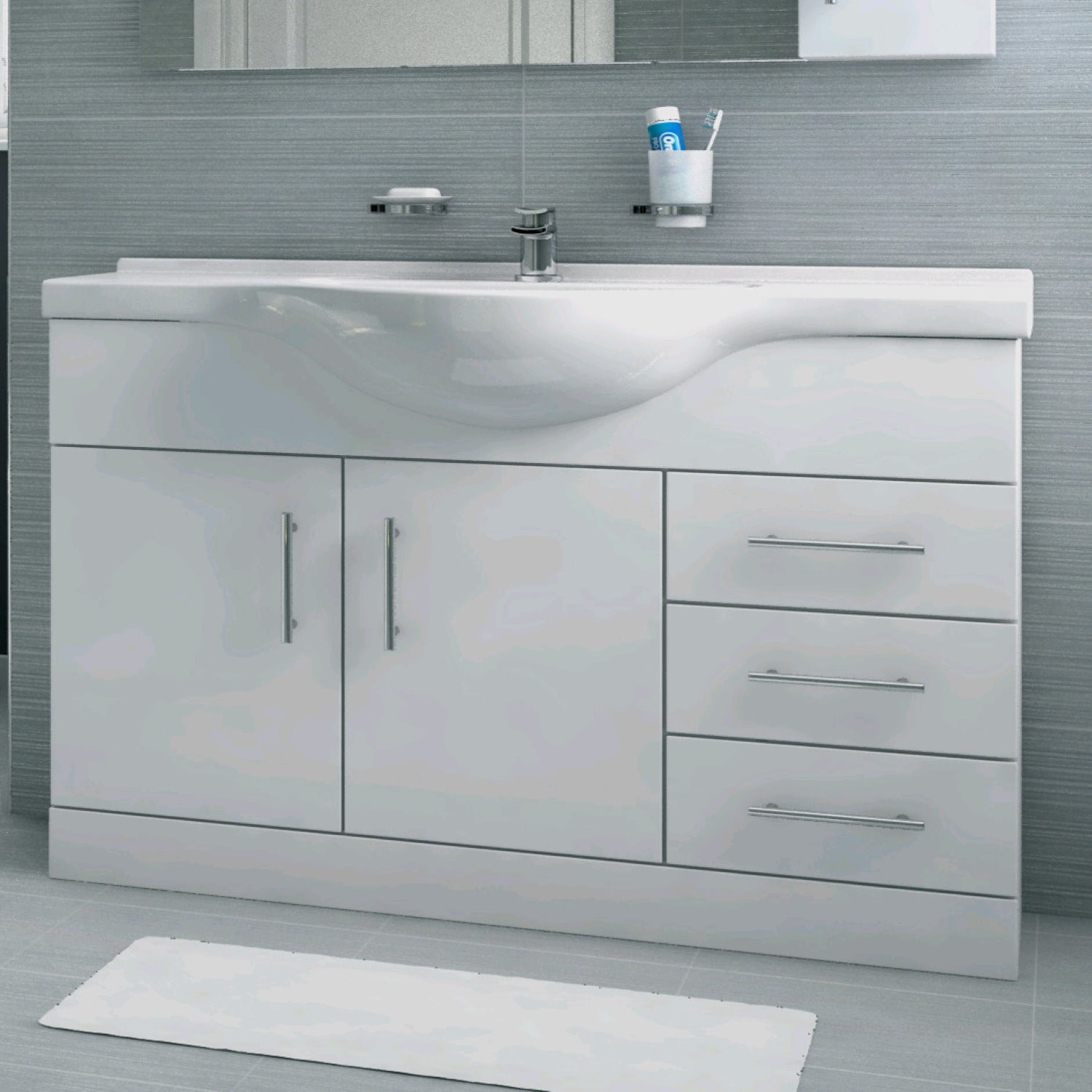 A large white vanity unit with 2 cupboard doors and 3 drawers. This unit comes complete with the ceramic basin.