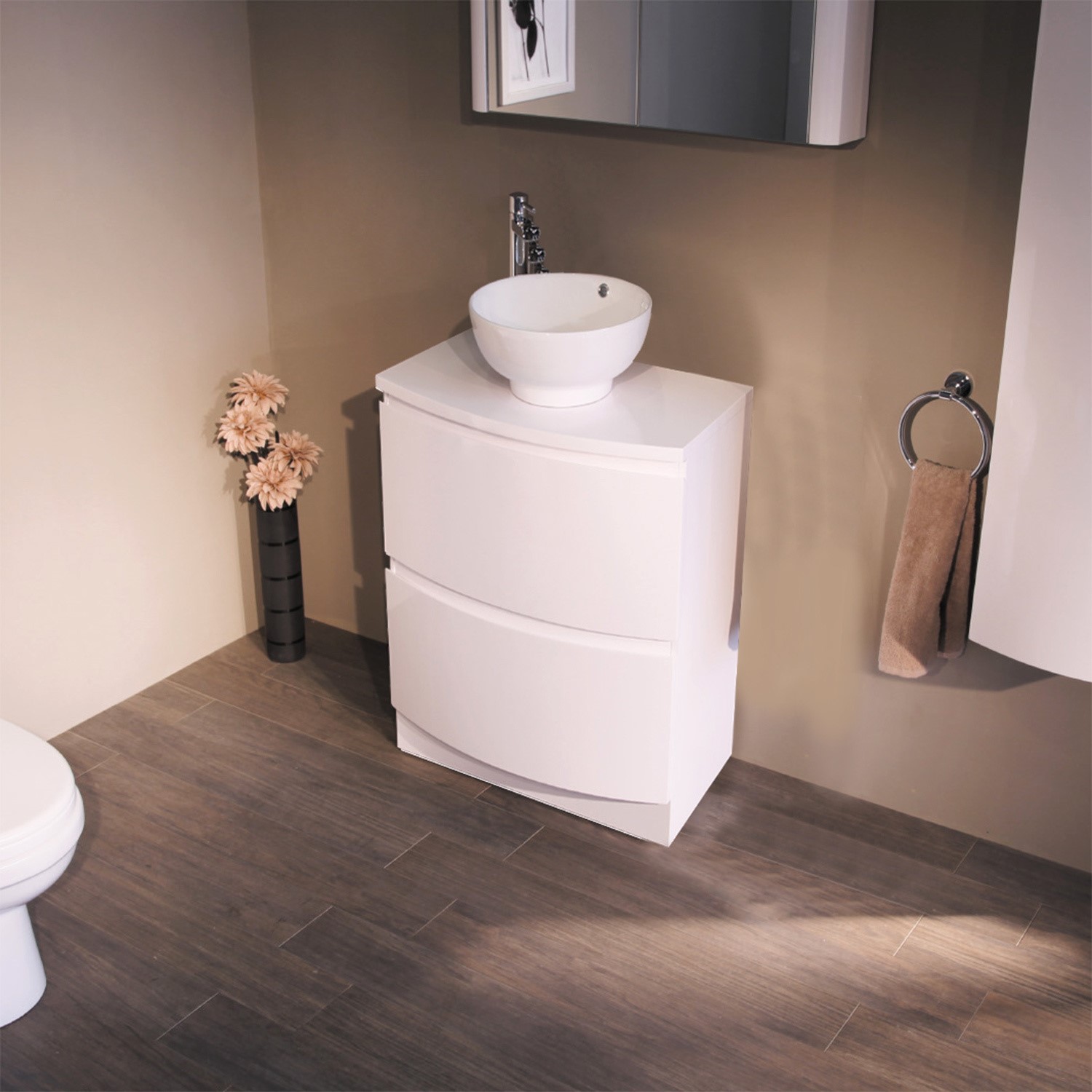 The Voss™ 620 floor mounted vanity unit is a beautifully crafted bow front vanity unit with matching countertop. The 2 soft close deep-fill drawers provide plenty of storage and the stylish design makes this vanity unit the perfect choice. 3 stunning countertop basins are available to choose from the drop down options and each perfectly compliments this fantastic unit. Also available in the Voss™ range is a WC unit storage units and mirrored cabinets so you can really create the complete look in your bathroom.