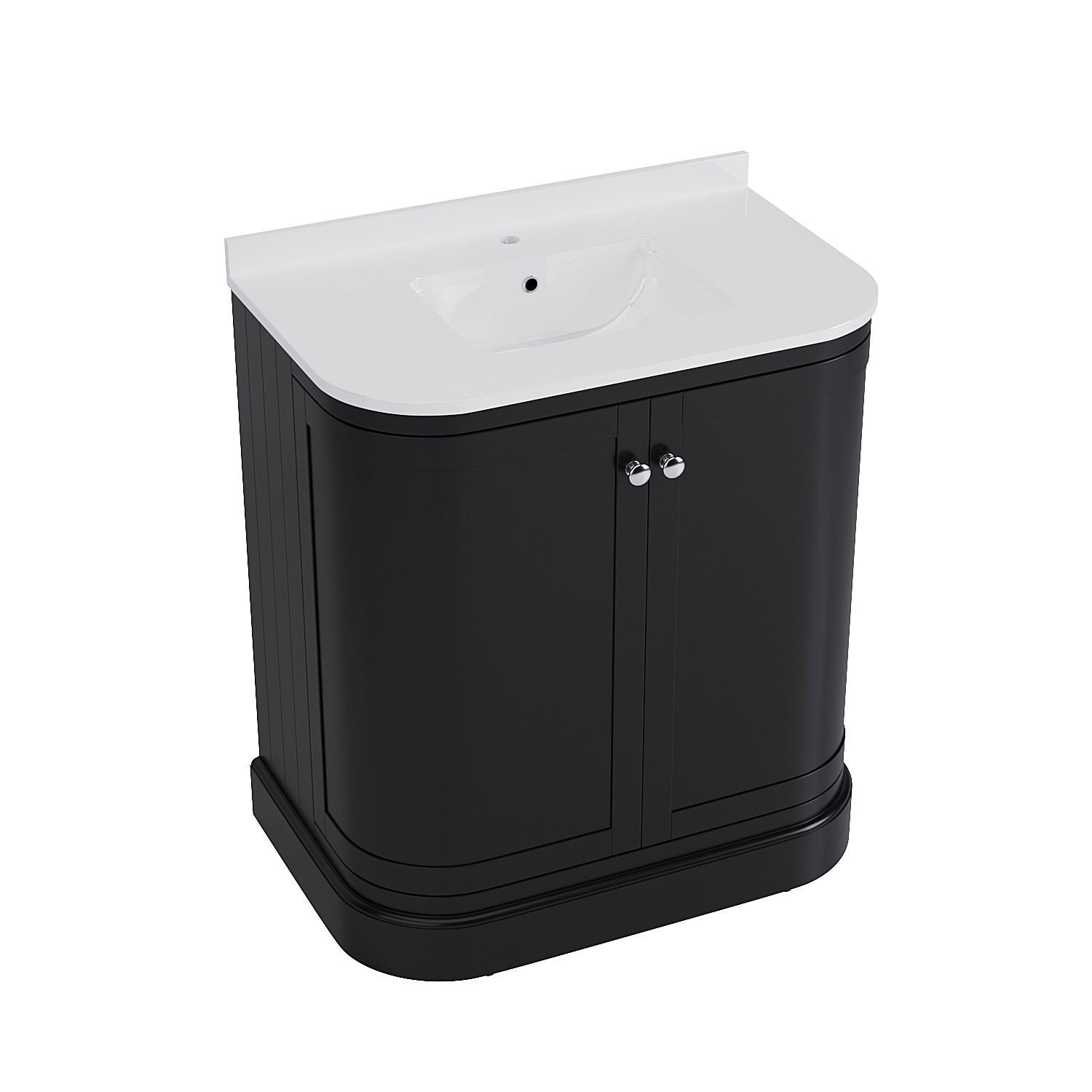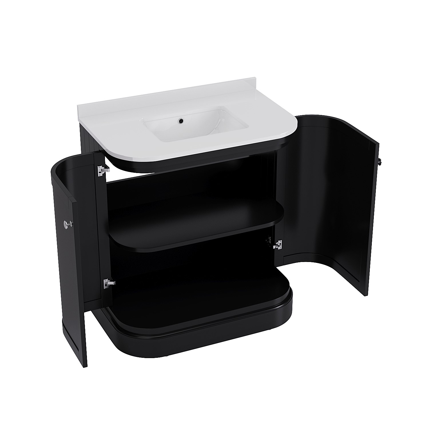 Transform your bathroom into a refined sanctuary with the Bowland 800mm curved Floorstanding vanity unit. Finished in a bold satin black, this vanity is inspired by timeless traditional elegance, this beautifully contoured design combines soft curves with a flawless finish, creating a statement piece that exudes sophistication. The unit features polished chrome handles for a touch of classic luxury, paired with a sleek resin inset basin, complete with matching chrome overflow cover and a premium quartz worktop surround—a combination that delivers durability and style in equal measure. Two soft close curved doors open wide to reveal an internal shelf offering generous under-sink storage, ideal for keeping everyday essentials organised and within easy reach.