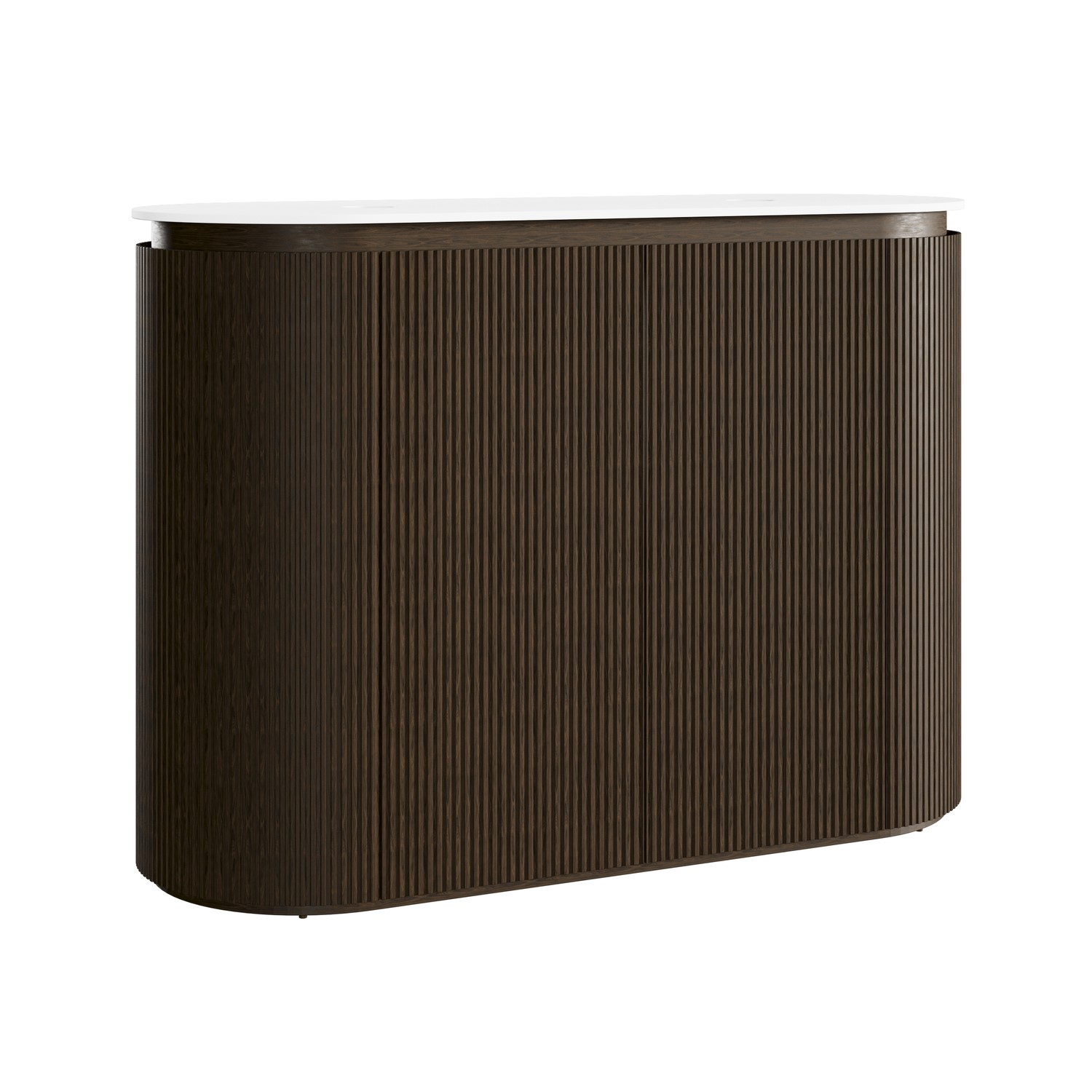 Curved Fluted Double Vanity Design: Freestanding double basin vanity unit with a modern curved walnut wood veneer fluted finish, adding texture and softness to any contemporary bathroom.