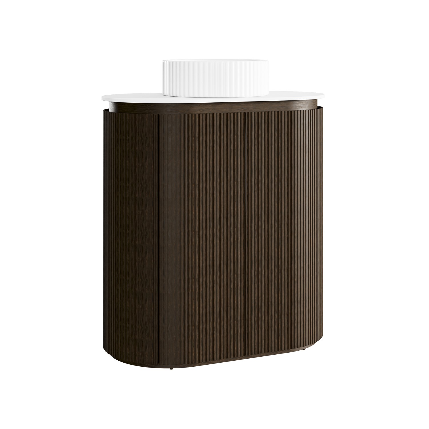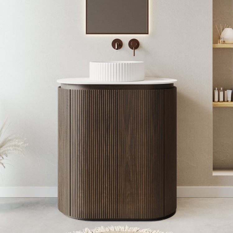 Curved Fluted Design: Freestanding basin vanity unit with a modern curved walnut wood veneer fluted finish, adding texture and softness to any contemporary bathroom.