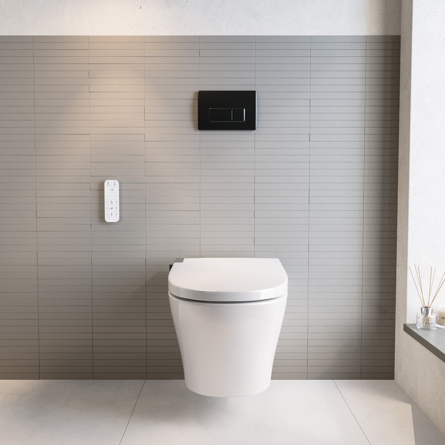 Control your smart toilet using the remote that attaches to a wall or via the on-seat control.