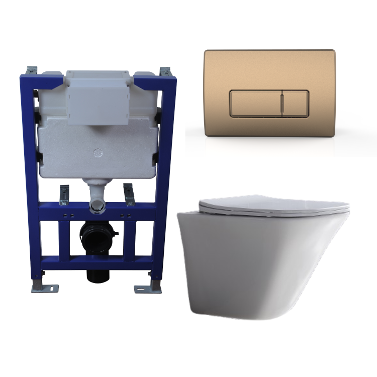 Transform your bathroom with the sleek Boston wall-hung toilet and Elira Brushed Bronze Pneumatic Flush Plate. Featuring a square design and gloss white finish, the toilet’s short projection is perfect for compact spaces. The rimless design improves cleanliness and water efficiency, while the soft-close seat ensures quiet operation. The wall-hung design saves floor space, offering a floating toilet effect with hidden pipework for easy cleaning.
