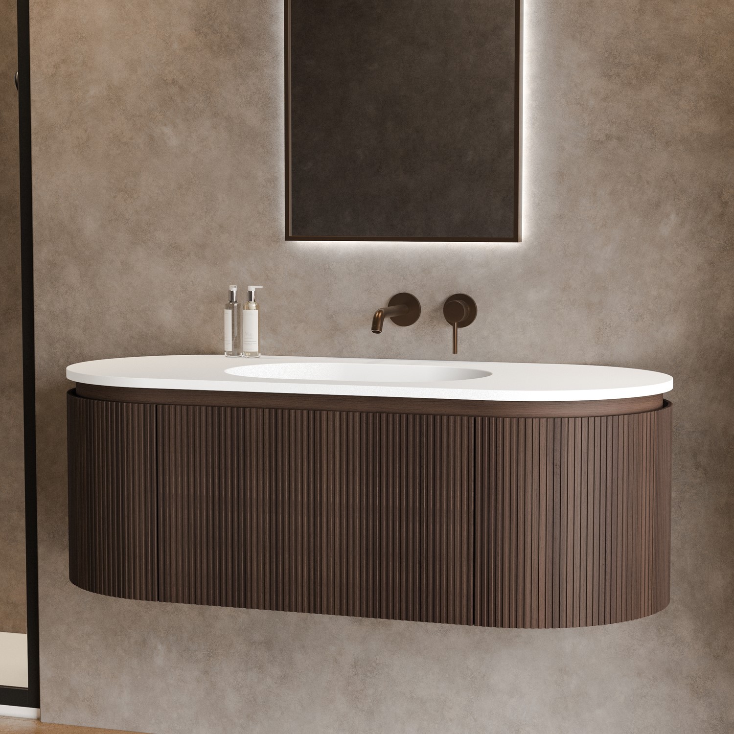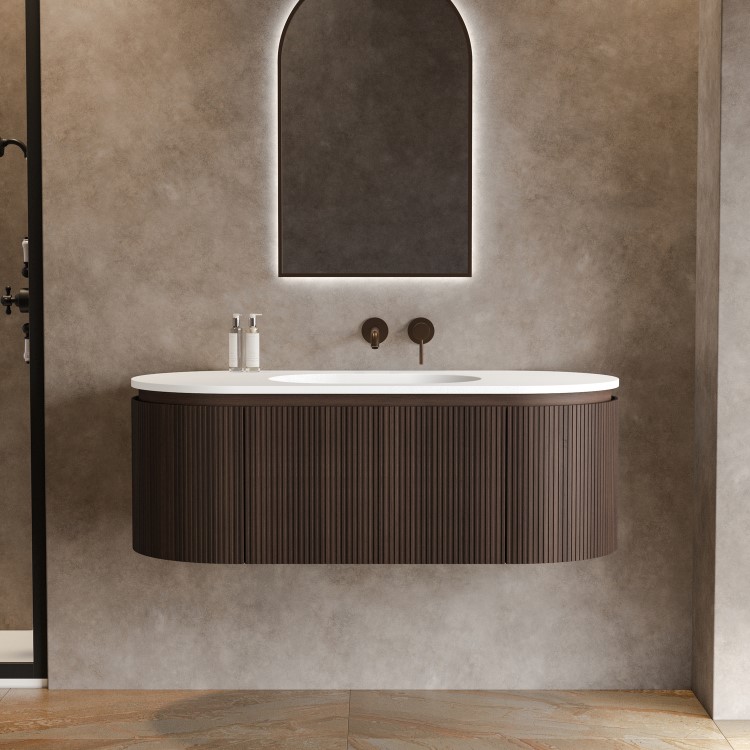 A refined expression of modern luxury, the Kobe 1200mm wall hung vanity unit is designed to anchor the bathroom with sculptural presence and quiet sophistication. Its elongated, softly curved form is wrapped in a vertical fluted walnut effect finish, delivering rich texture and artisanal depth while maintaining a clean, contemporary profile. Every detail is intentional—from the precision-aligned fluting to the concealed storage drawer that preserves the vanity’s architectural purity. The drawer opens with the concealed chamfered edged handle and closes with a soft close mechanism to ensure an extra touch of luxury. The floating installation enhances the vanities statement quality, whilst also opening up floor space to create the feeling of a more open and larger bathroom.