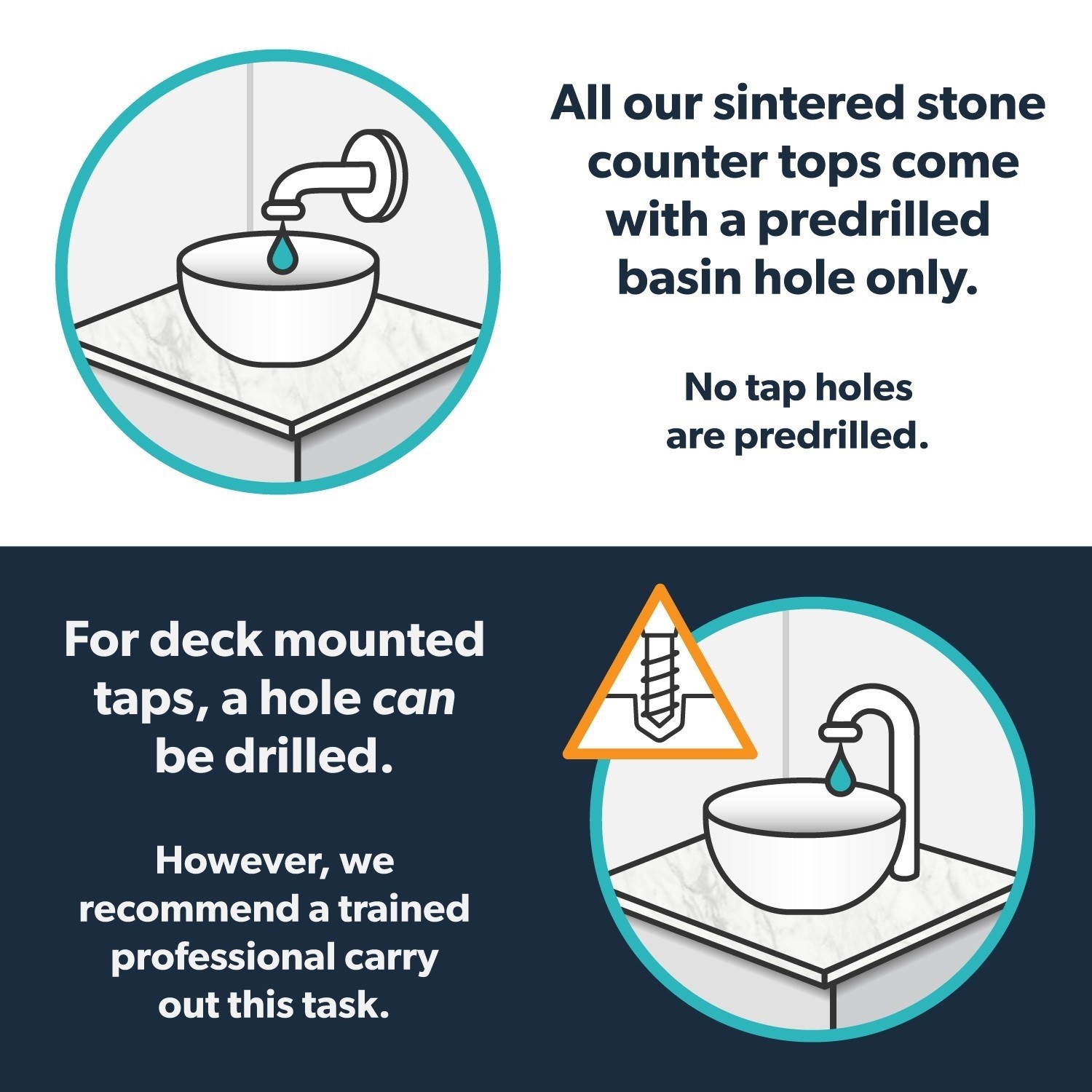 Featuring a premium sintered stone counter top, this toilet and sink unit is as durable as it is stunning. This low maintenance, non-porous material is waterproof, stainproof & is very hard to chip, scratch or damage. This unit comes without a countertop basin, so you are free to pick one of your choice. For your convenience a basin hole is already drilled so you can install the basin with ease. Taps are not included, and the worktop comes with no pre drilled tap holes, giving you the option to use a wall-mounted basin tap, or drill holes to use a tall basin mixer tap - you should use a trained professional to drill the hole.