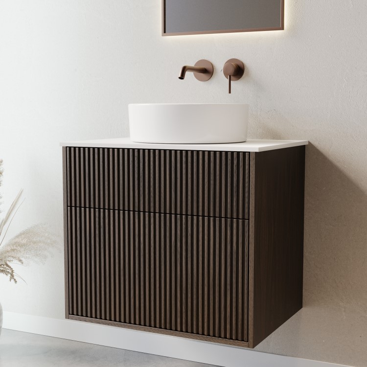 Upgrade your bathroom with our dark wood effect fluted Matira 650mm wall hung vanity unit bringing a contemporary luxe style to your home. The floating vanity unit offers a space saving solution, opening up your floor space, whilst providing ample storage. The two deep fluted drawers with push to open and soft closing mechanisms add a premium touch to your bathroom.
