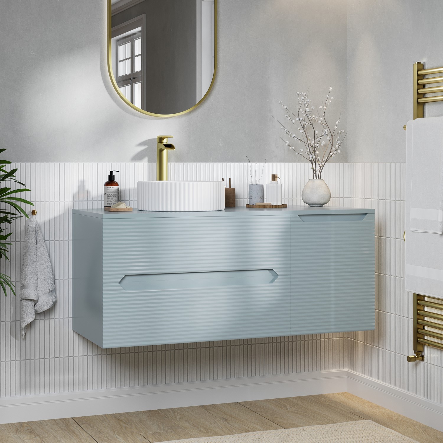 Stylish and space-saving, the Melbourne Blue 1200mm wall hung vanity unit blends functionality with refined modern design. Finished with fluted drawer fronts, this floating vanity brings both architectural texture and a soft pop of colour to modern bathrooms. This unit is designed to last while offering a clean, versatile look that suits a variety of styles. Its wall-hung design makes it an excellent choice, as it maximises floor space while keeping the room feeling open.