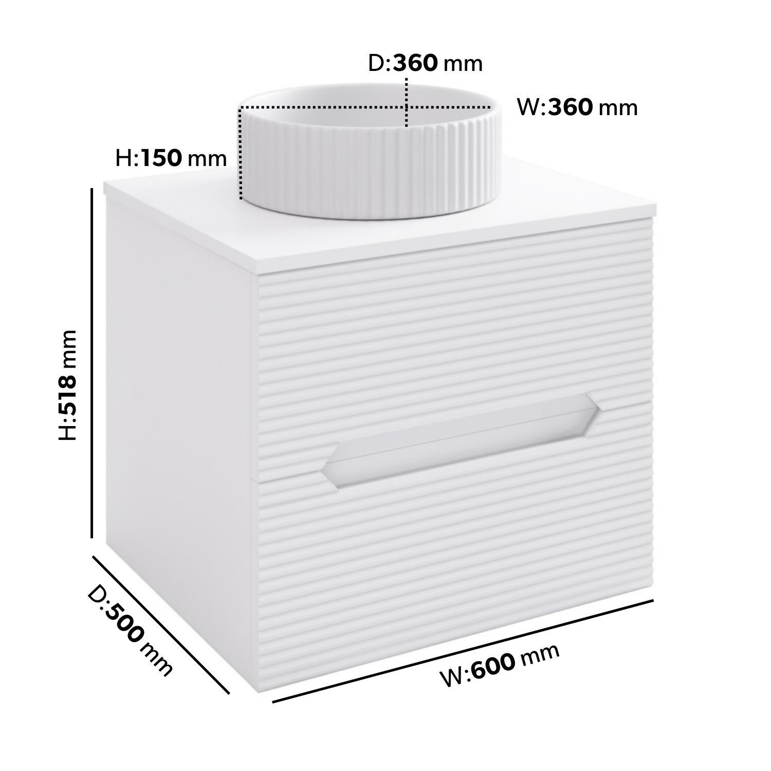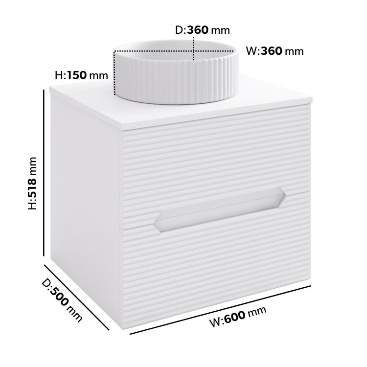 - Overall Dimensions: H518 x W600 x D500 mm (Please note, the main footprint of this vanity unit is W590 x D495 mm, however the overall dimensions are slightly bigger due to the worktop overhang)