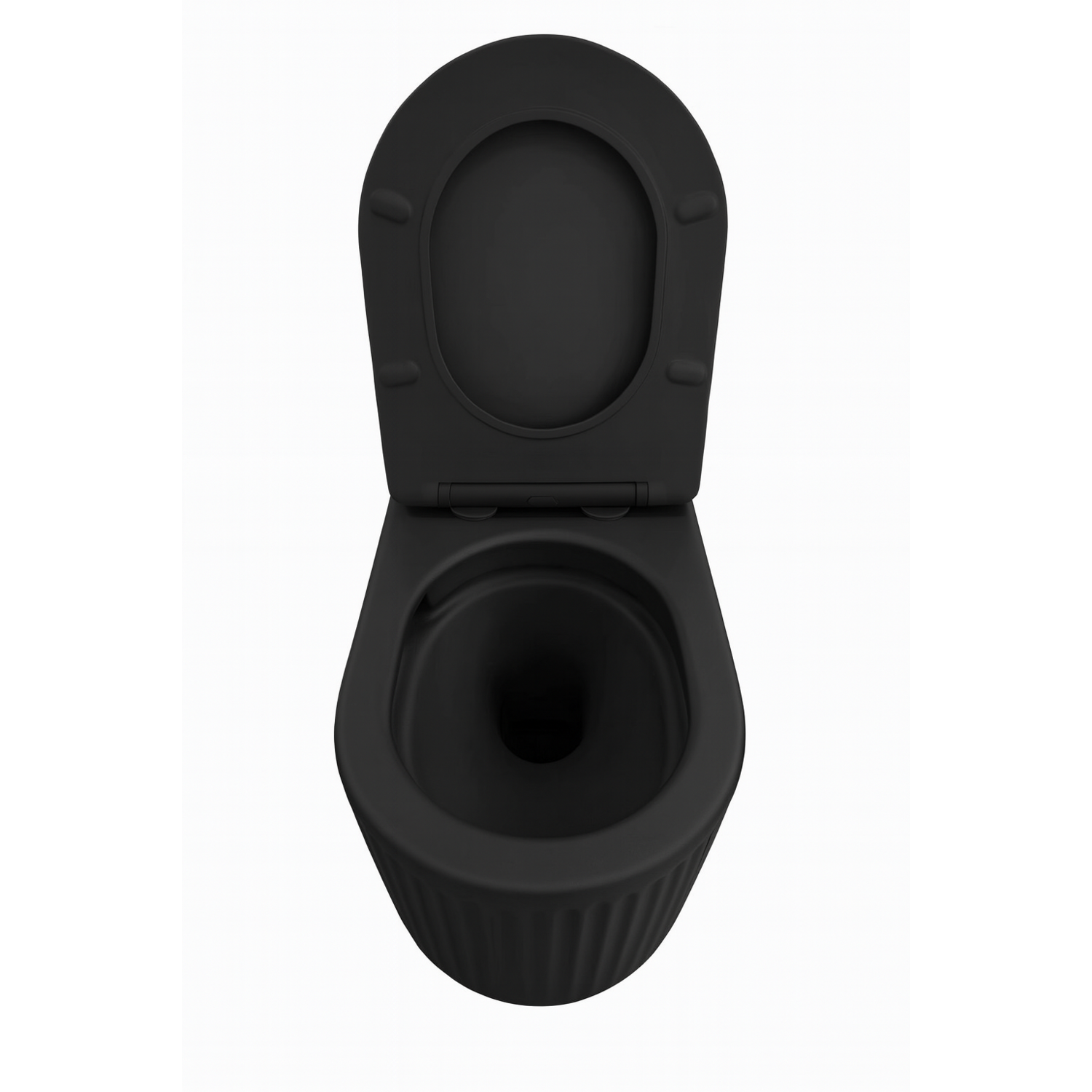 Upgrade your bathroom with the Oregon Wall Hung Toilet in matt black. This elegant, wall-mounted toilet is designed to save space and add sophistication to any bathroom. The toilet features a beautifully crafted fluted design on its ceramic body, offering texture and an elevated look that complements any modern bathroom. Its tornado/vortex flush technology ensures efficient, quiet flushing while keeping water use to a minimum. The toilet's durable ceramic body and rimless design make it easy to maintain, and the included soft-close seat provides a smooth, quiet operation.