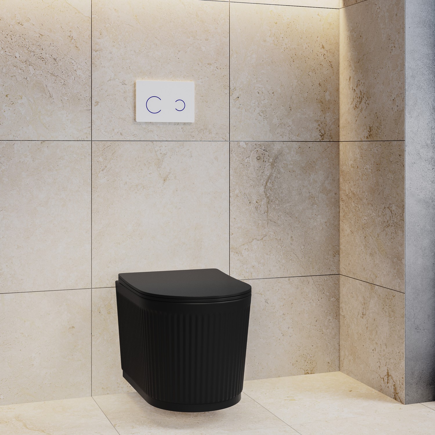 Upgrade your bathroom with the Oregon Wall Hung Toilet in matt black. This elegant, wall-mounted toilet is designed to save space and add sophistication to any bathroom. The toilet features a beautifully crafted fluted design on its ceramic body, adding texture and a touch of modern elegance. Its tornado also called vortex flush technology ensures efficient, quiet flushing while keeping water use to a minimum. The toilet's durable ceramic body and rimless design make it easy to maintain, and the included soft-close seat provides smooth, quiet operation.