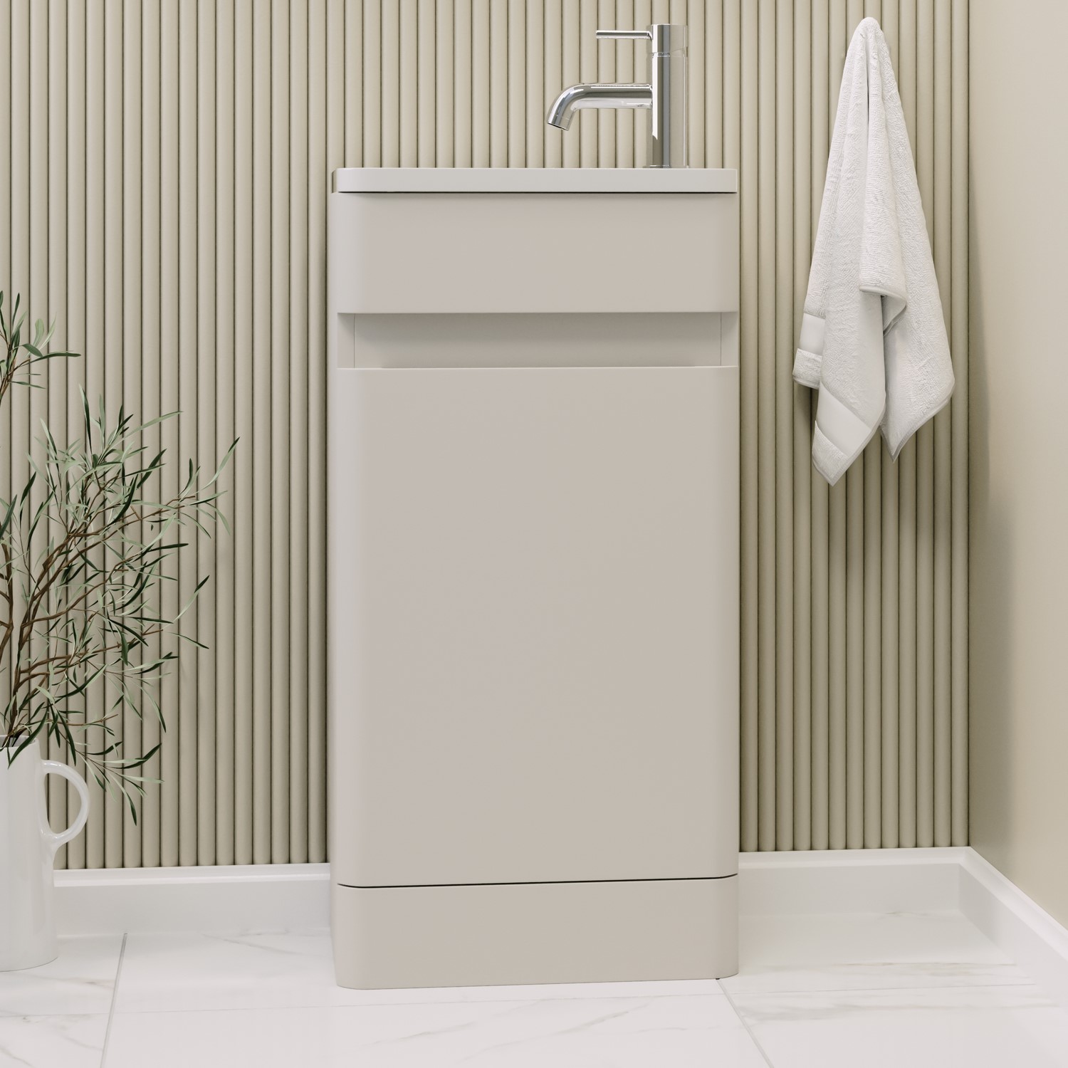 Give your bathroom a fresh, modern look with this sleek 410mm floor-standing vanity unit from the Pendle range. Designed for contemporary spaces, it delivers a minimalist aesthetic while offering a sturdy, space-saving solution. This freestanding vanity unit features a reversible soft-close door, allowing flexible installation depending on your layout. Inside, you'll find one internal shelf creating two generous storage compartments, perfect for keeping your essentials tidy and within reach. The fitted resin basin has a white gloss finish that adds a clean, bright touch to your space. It comes with a pre-drilled tap hole located on the right-hand side for ease of installation. Please note, the basin is not reversible. This unit arrives preassembled, so all you need to do is secure the basin. Choose a cloakroom basin mixer tap of your choice of finish to complete the look . Please note, the basin comes with a pre-fitted chrome overflow cover. This vanity pairs perfectly with the Pendle toilet unit for a cohesive, modern cloakroom setup. While the unit is water-resistant, it isn't waterproof so we recommend wiping away any splashes or spills to help keep it looking its best and performing well over time.