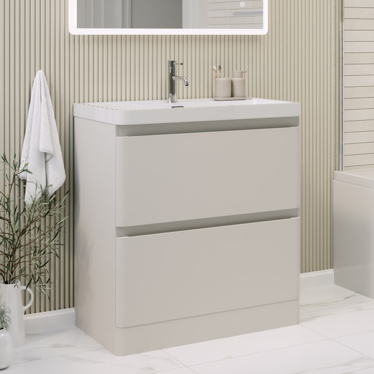 Give your bathroom a fresh, modern look with this sleek, matt beige 800mm floor-standing vanity unit from the Pendle range. Designed for modern living, it offers a contemporary, minimalist look while providing a sturdy, space-saving solution. This freestanding unit features two deep, spacious soft-close drawers with integrated handles, ensuring ample storage for all your bathroom essentials while maintaining a seamless design. The extra height of the floorstanding design allows for deeper drawers, making it ideal for storing bulkier items and maximising vertical space. Its elegant curves complement any modern family bathroom and pair perfectly with the Pendle toilet unit. This vanity unit includes a fitted resin basin with a gloss white finish for a fresh, stylish touch, which reflects light beautifully. This unit comes preassembled—simply secure the basin. Choose a basin mixer tap of your choice of finish to complete the look. Please note, the basin comes with a pre-fitted chrome overflow cover. While the unit is water-resistant, it isn't waterproof so we recommend wiping away any splashes or spills to help keep it looking its best and performing well over time.