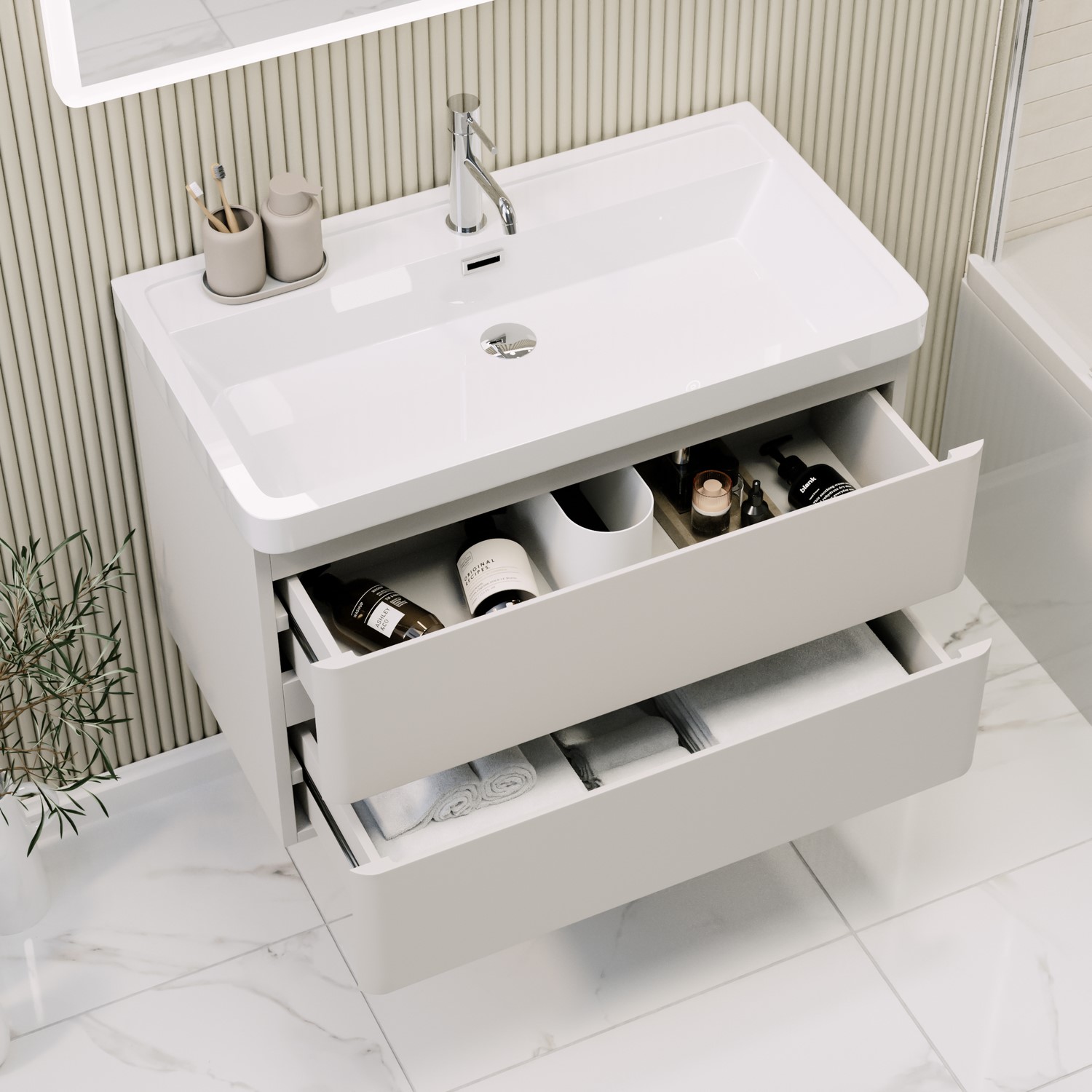 Maximise your bathroom’s floor space with this sleek, matt beige wall-hung 800mm vanity unit from the Pendle range. Its floating, wall-hung design creates a modern, minimalist look whilst adding extra floorspace and making floor cleaning effortless. This wall hung vanity unit is designed for convenience, featuring two spacious soft-close drawers with integrated handles, providing ample storage for your bathroom essentials. The unit’s elegant curves complement any contemporary family bathroom and pair perfectly with the Pendle toilet unit. This vanity unit includes a fitted resin basin with a gloss white finish for a fresh, stylish touch, which reflects light beautifully. This unit comes preassembled, all you have to do is simply secure the basin. Choose a basin mixer tap of your choice of finish to complete the look. Please note, the basin comes with a pre-fitted chrome overflow cover. While the unit is water-resistant, it isn't waterproof so we recommend wiping away any splashes or spills to help keep it looking its best and performing well over time.