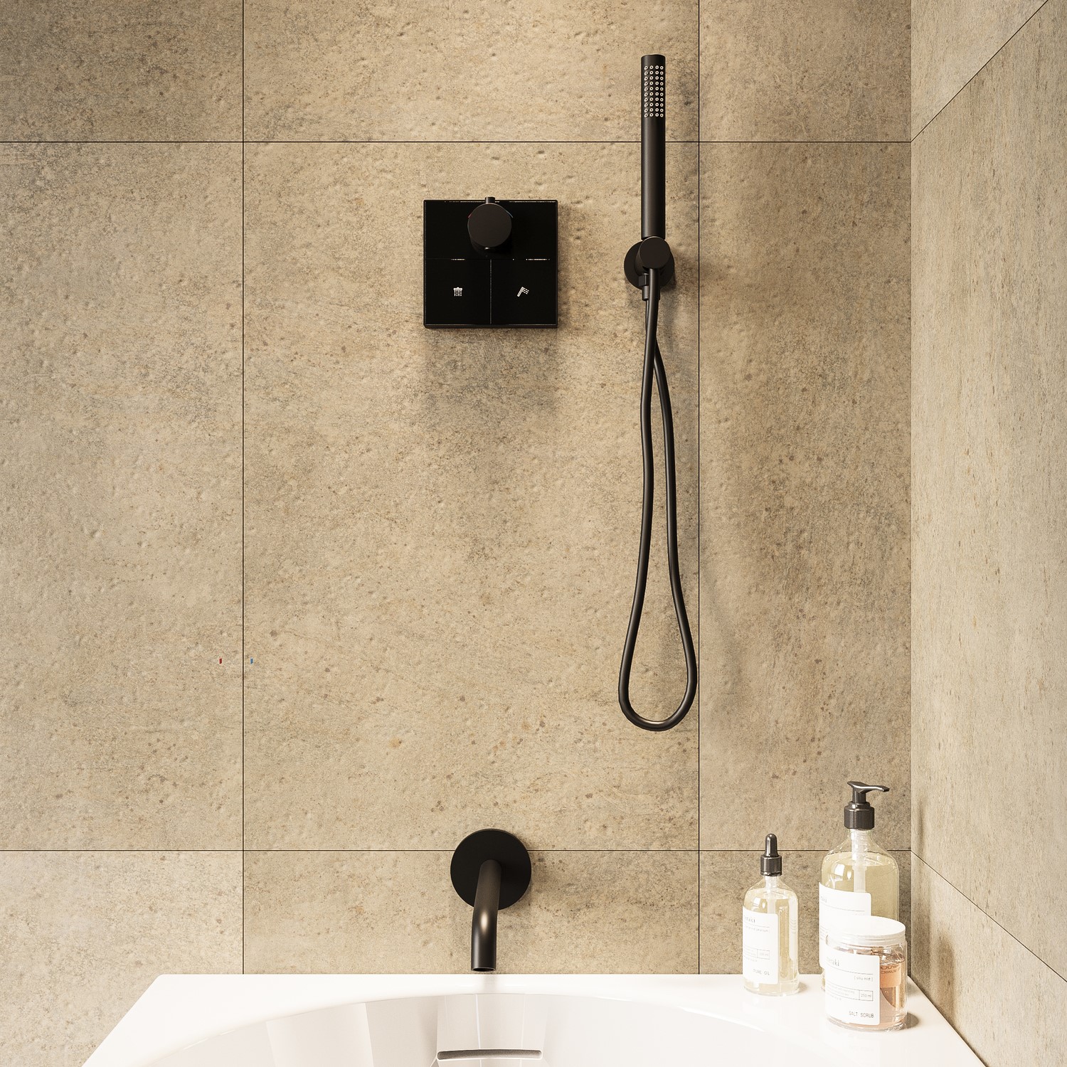 Upgrade your bathroom with this complete Matt Black Shower & Bath Set, combining the Priya concealed valve, bracket with hose, and bath spout in one sleek package. Together, they deliver a bold, contemporary look with the practicality you need for everyday use.