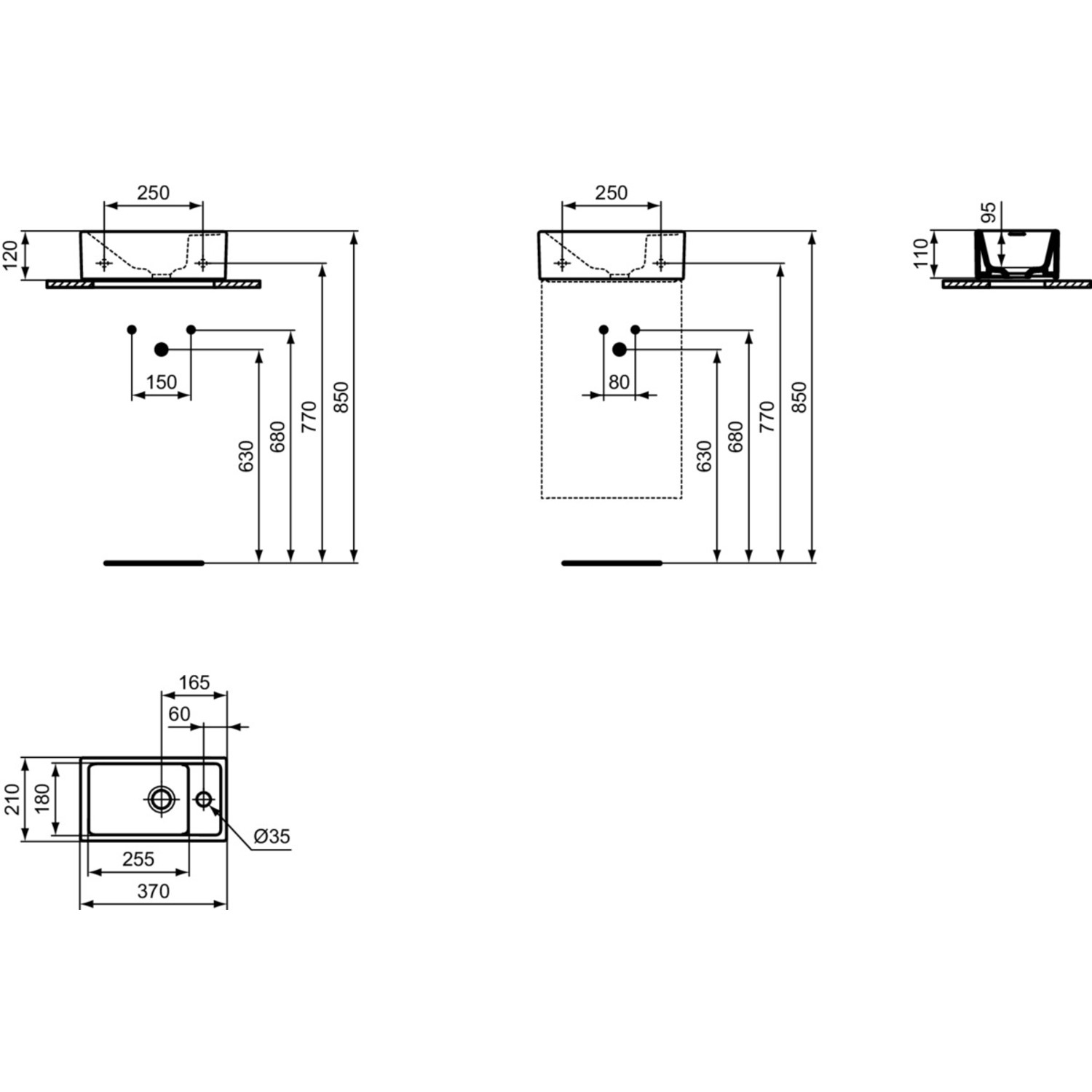 - Overall Basin Vanity Dimensions (including basin): H670mm x W370mm x D210mm