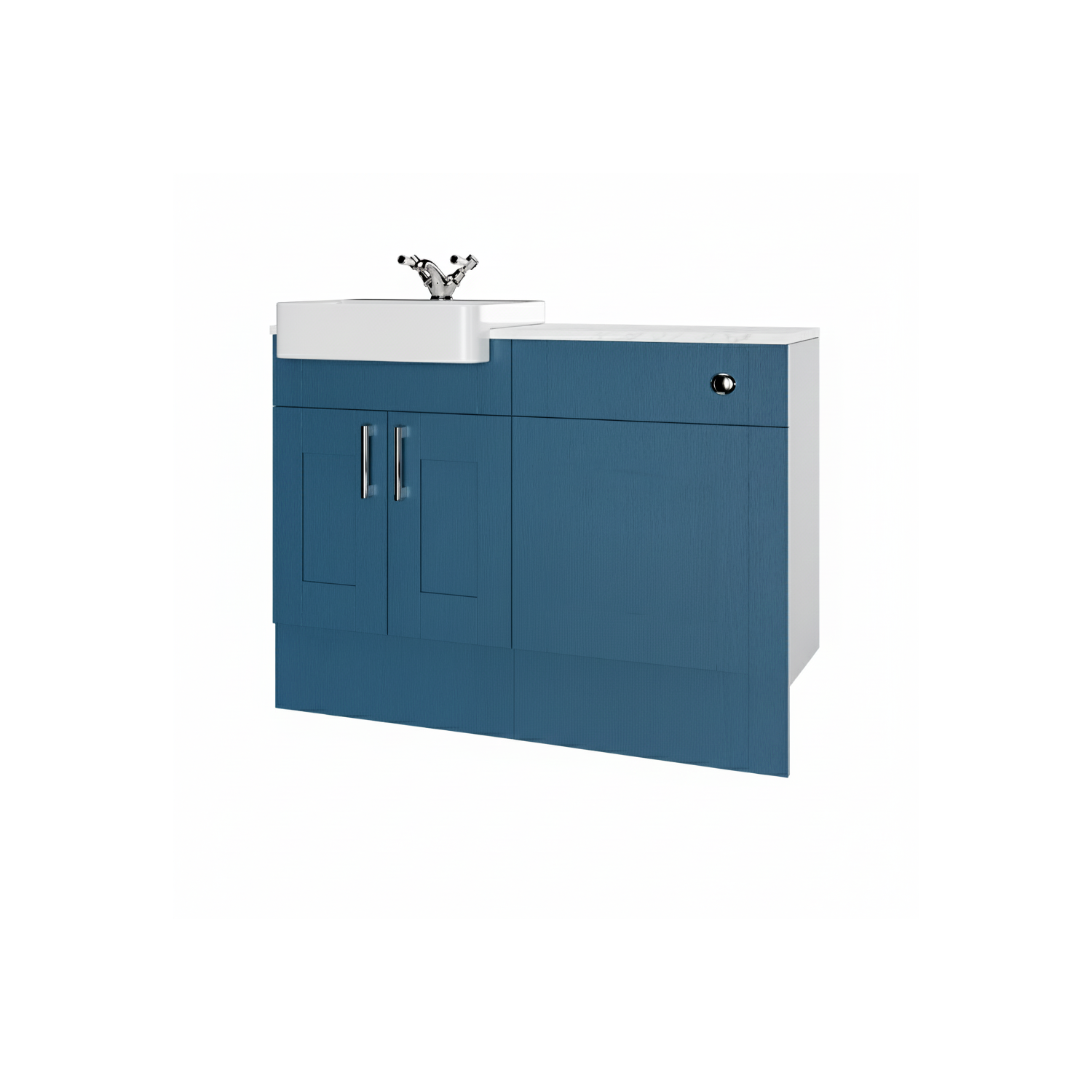 This Vancouver toilet and sink unit brings traditional charm to fitted bathroom furniture. The 1200mm width comprises a 600mm vanity unit paired with a 600mm toilet unit, both finished in a fresh blue tone with a matt wood grain effect. Shaker-style soft close doors with elegant detailing give this piece its classic character, whilst the shelved compartment within the vanity keeps your bathroom essentials neatly organised.