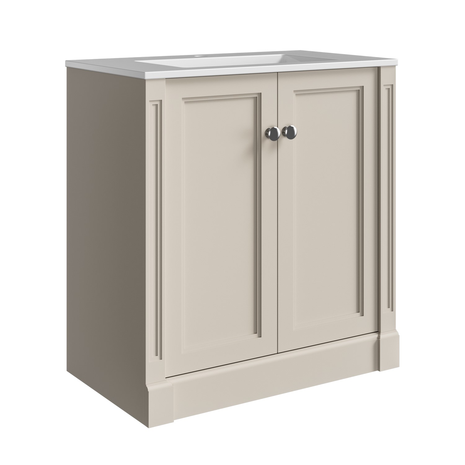 Detailed Shaker Design: Classic mouldings and beige finish bring timeless elegance to your bathroom.