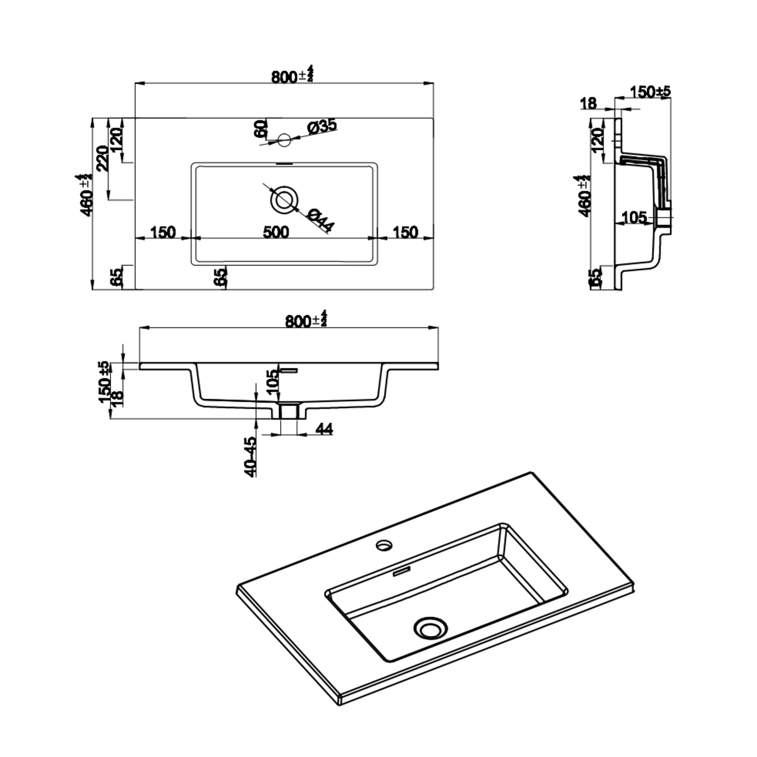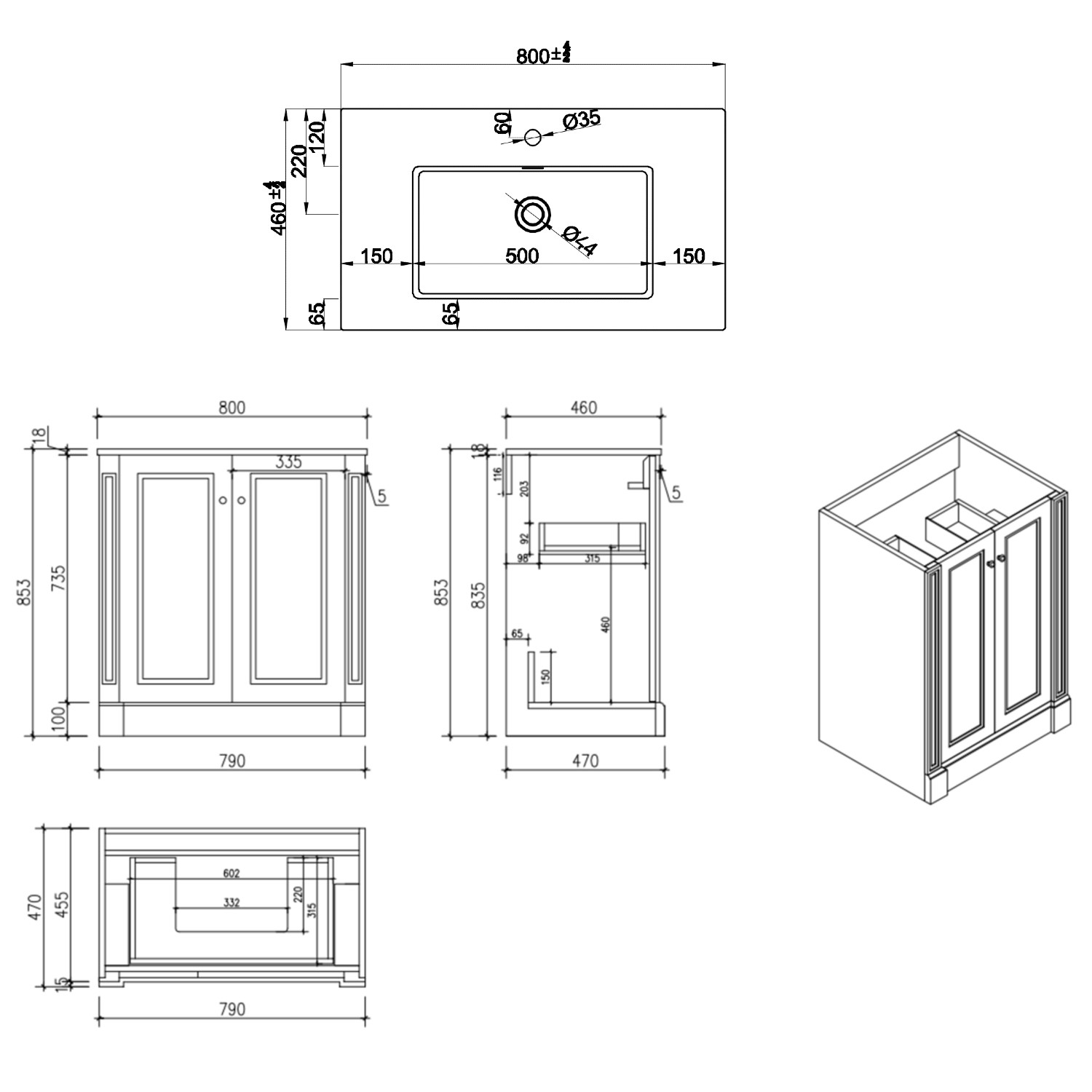 - Overall Basin Vanity Dimensions (including basin): H853 x W800 x D470 mm