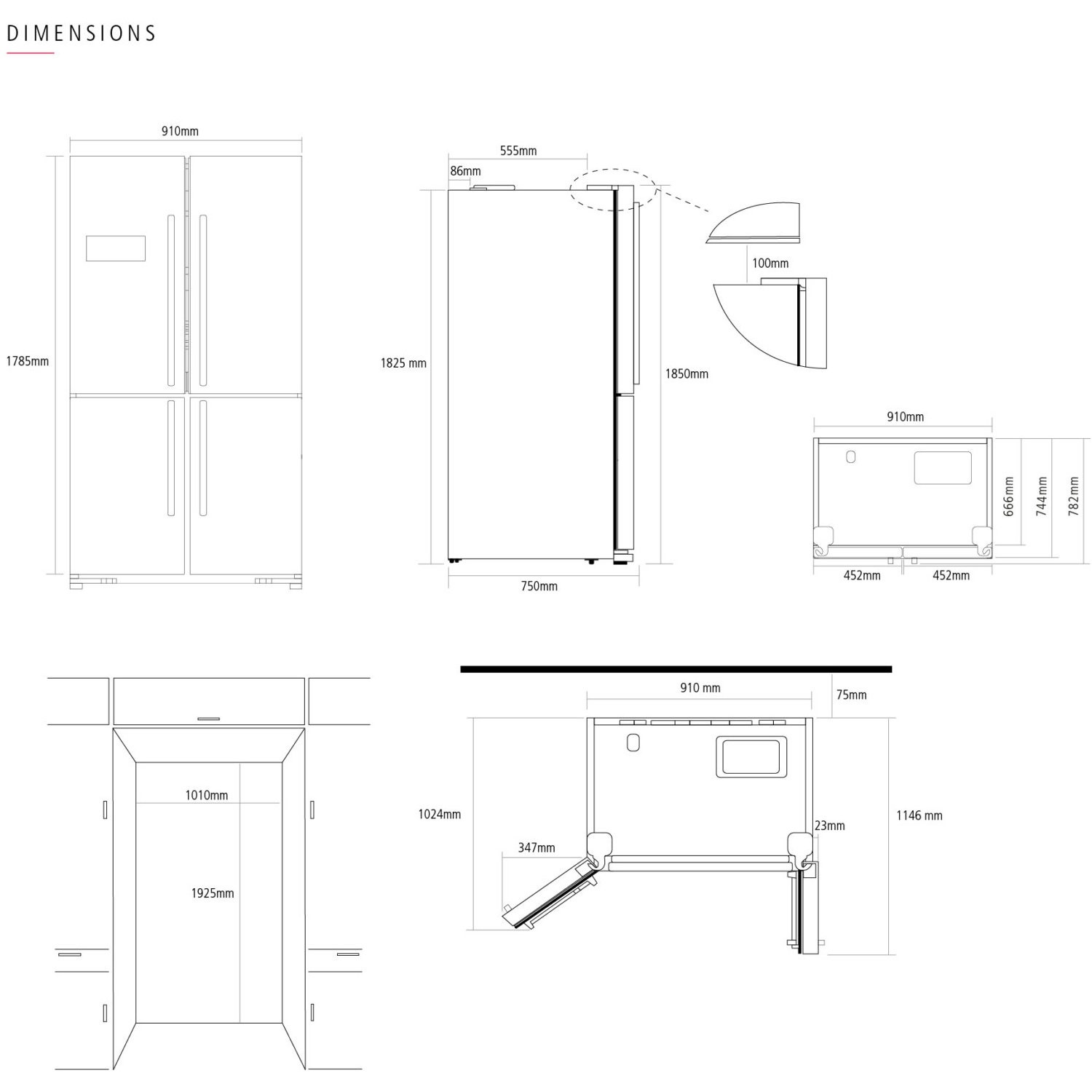 - Dimensions (mm, excluding handle): H1850 x W910 x D744