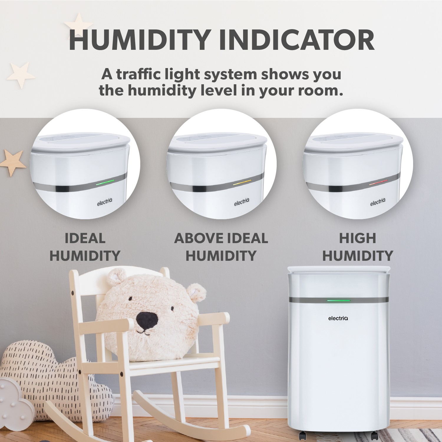 The power-saving humidistat lets you set & maintain the perfect humidity automatically, and the clever traffic light humidity indicator lets you check your humidity levels at a glance (green is good!).