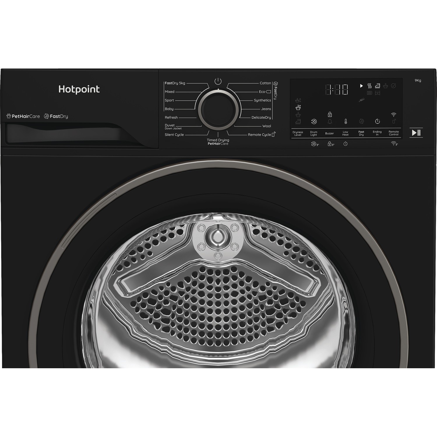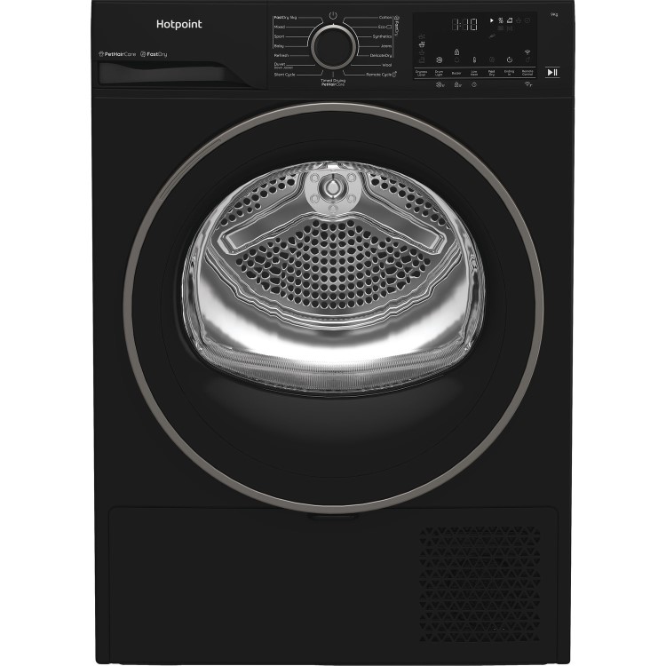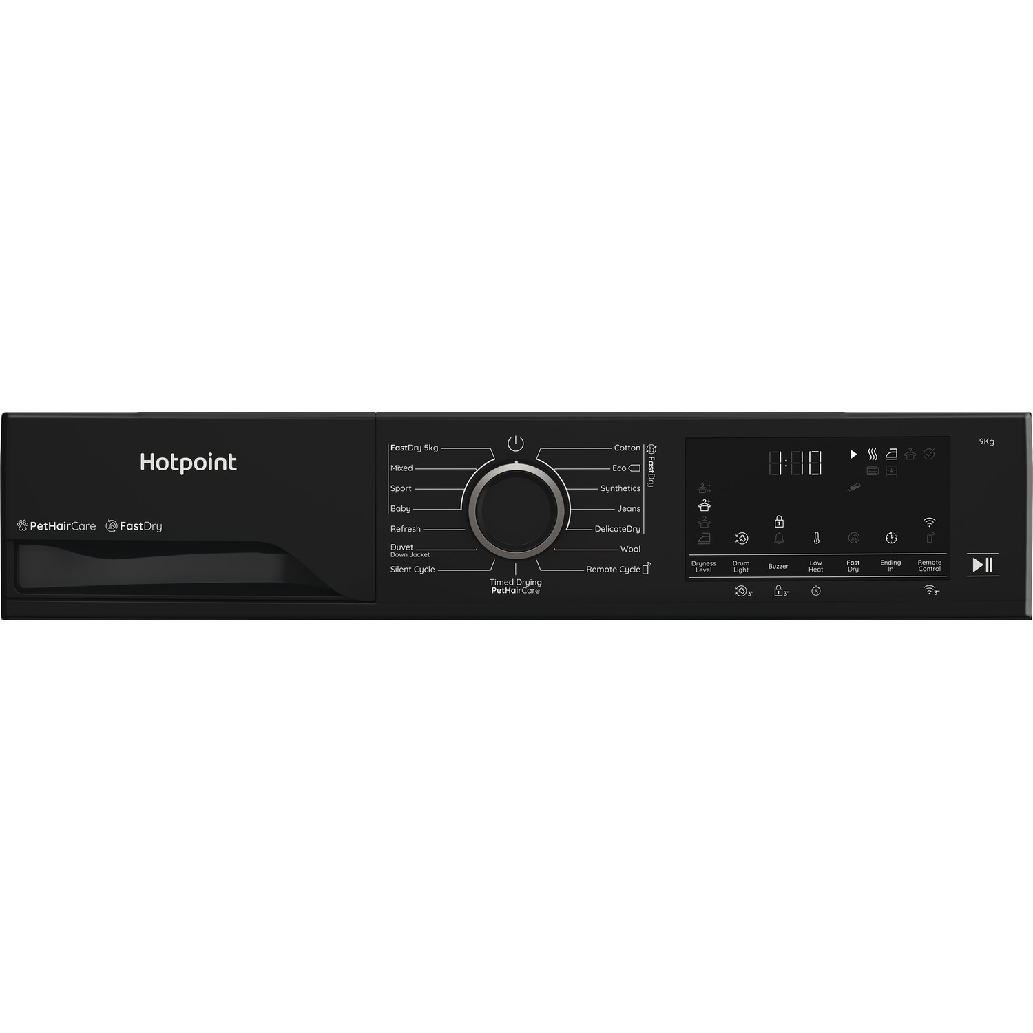 Meet the Hotpoint Fabric Care C HD 94M BBS UK 9kg Heat Pump Tumble Dryer in a sleek black finish. This A+++ rated dryer uses clever Heat Pump technology to save you money on your energy bills, making it a smart choice for your home. With its large 9kg drum, it handles family-sized loads with ease. If you have furry friends, the special PetHairCare cycle uses steam to gently lift and trap fur, leaving your clothes clean and fresh. Plus, with Smart Wi-Fi, you can control your laundry from anywhere using your phone, making life even simpler.