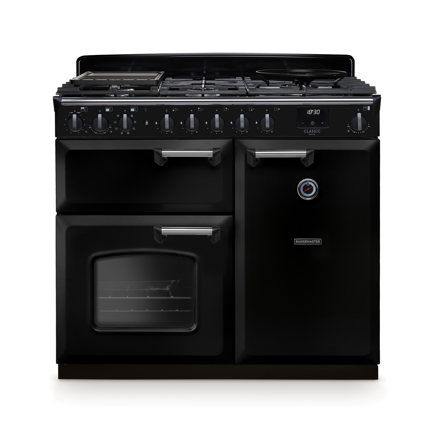 Rangemaster Classic Deluxe 100cm Dual Fuel Range Cooker - Gloss Black & Chrome